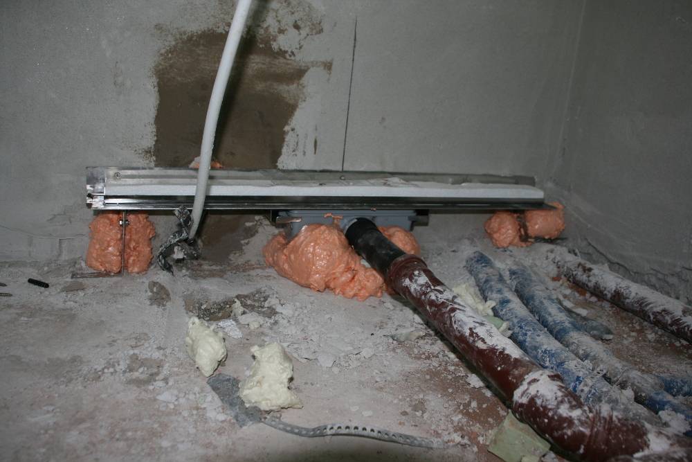 Die Rinne ist hinten hochgezogen und wird zusätzlich an die Wand geschraubt. Ist stabiler während der Estrich gemacht wird und durch den Hochzug nach hinten automatisch dicht. Man braucht dann auch hinter der Duschrinne keinen schmalen Fliesenstreifen mehr legen und die Rinne ist so nahe an der Wand, daß sie beim Duschen sicher nicht stört. |