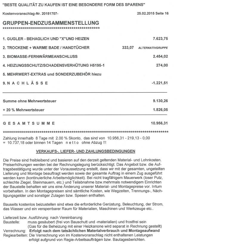 @atma: du hast Recht, ich habe dann nicht mehr geschrieben dass ich mich letztlich fürs KNX entschieden habe. Liegt wahrscheinlich daran dass ich im Moment nicht mal weiß wo mir der Kopf steht. Sorry!! Ich finde dass Vergleiche nirgends so schwierig sind wie beim Installateur: Jeder bietet etwas anderes an und behauptet seine Sachen sind die besten...... :-/ und du selber als Laie weißt nicht einmal wo du überhaupt anfangen sollst mit informieren... Meine Motivation, das Angebot reinzustellen war die, dass ich ein 2. Angebot bei einem namhaften Installateur aus meiner Gegend einholte, der gleich um 6000 teurer war! Wenn ich jedoch nur die Endsummen reinstelle, bringts auch niemandem was. Denn "Behaglich und Xund heizen" ist nichtssagend........ |
