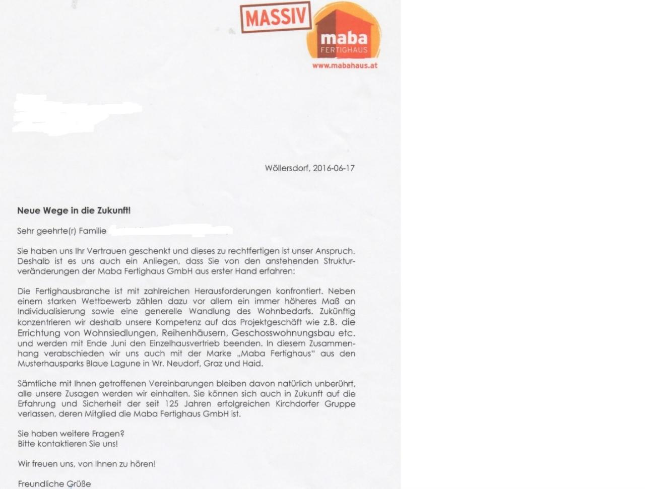 wie uns heute ein Schreiben erreicht hat und ebenso auch die Bauleiterin kontaktierte, zieht sich Maba aus der Fertigung von Einfamilienhäusern zurück.