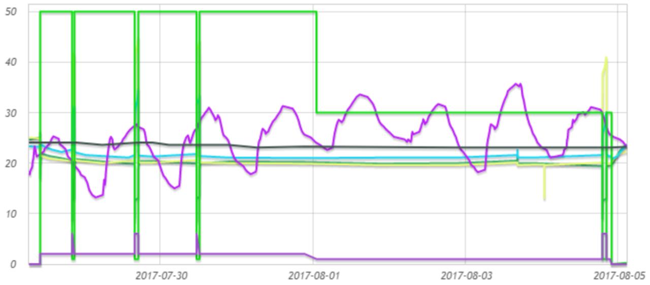 in den kurven sieht man ganz gut, dass nach 24h schon 2K aus dem estrich gezogen werden. nach 48h stabilisiert sich eine temp-diff innentemperatur zur mittleren estrich-temp von ca. 2-2,5K.