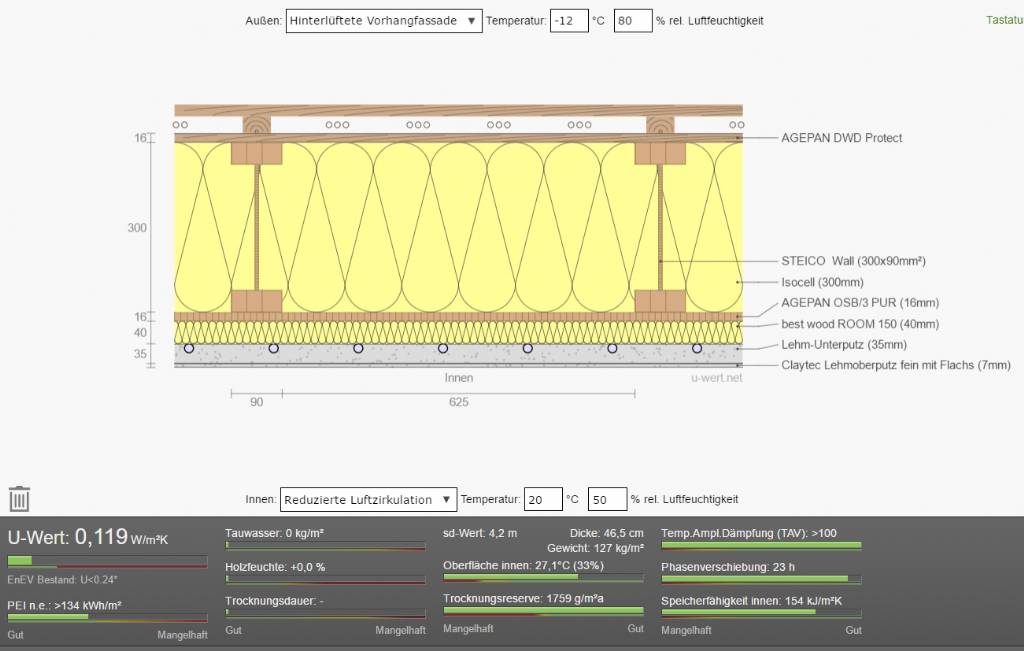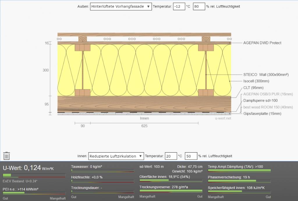 Wichtig für dich ist ja, das die "richtige" Installationsebene keinen negativen Einfluss auf die Speicherfähigkeit der inneren Schichten hat. Überlegen kannst du aber, ob du in der Wand das CLT überhaupt brauchst. Womit möchtest du denn dämmen? Den Lehmputz habe ich mal mit reingebracht, weil ich persönlich das so machen werden, in Verbindung mit Wandheizung. Die Wandheizung hat auch noch einmal positiven Einfluss auf das Speichervermögen. CLT werde ich wahrscheinlich in Zwischendecke und Dach verbauen. Bei gleicher Dämmung würde das so aussehen: Der Wandaufbau wird dünner. Beim Wandaufbau würde ich CLT nur nehmen, wenn Sichtqualität. Es sei denn du willst einfach eine Putzträgerplatte dran bringen und verputzen. Finde ich aber Cellulose nachhaltiger. LG |