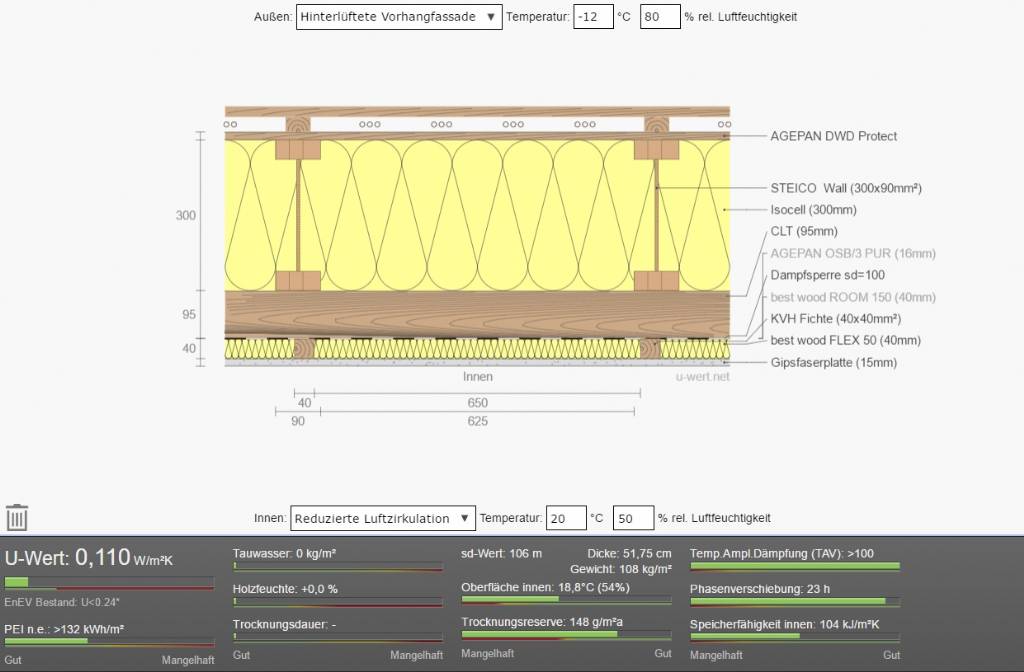 bist ja ganz schön ungeduldig. Für solche Berechnungen empfiehlt sich immer u-wert.net. Ich habe Spaß an solchen theretischen Berechnungen, deshalb hier mal ein paar Varianten. Die Dampfsperre kannst du getrost vergessen, CLT/KLH muß nur an den Stoßstellen verklebt werden (nur für die Berechnung drinnen). Variante 1 ohne Installationsebene: Variante 2 flexibele Holzfasermatte: Variante 3 Holzfaserplatte (wie du angesprochen hast) Variante 4 mit Lehmputz und Holzfaserplatte: Achte auf die Speicherfähigkeit innen, das beantwortet deine Frage. Die letzte Variante ist offensichtlich die beste, aber auch die teuerste. |