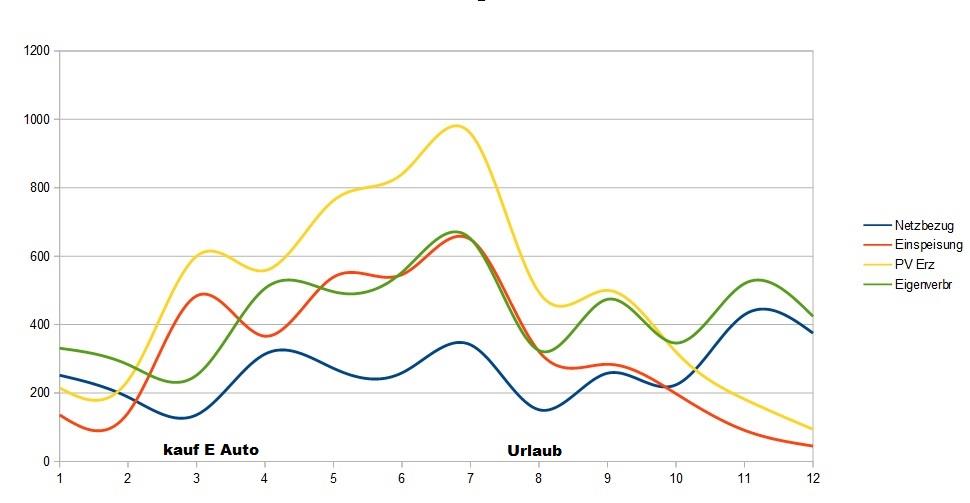 Habe jetzt mal das Excel grafisch ausgewertet, ich habe stark geglättet da die Daten auf monatlich abgelesenen Zählerständen beruhen und ich nicht immer im 1. des Monats abgelesen habe. Im Endeffekt ist es egal, man sieht den Verlauf. Gut zu sehen wie mit Anschaffung den E Autos der Stromverbrach angestiegen ist, damals bin ich noch 60km gependelt + sonstige Fahrten. Ende Juli war 2 Wo Urlaub, weniger km gefahren bzw. viel von PV geladen. Im selben Zeitraum war das Wetter nicht so sonnig darum der Einbruch bei PV Erzeugung, die Aufzeichnung des WR WR [Wechselrichter] bestätigt das der August schlechter war als September. Von was der Verbrauchsanstieg im Juli kommt weiß ich nicht genau. Zu der Zeit wurde der Aussenputz gemacht, warscheinlich ging da so viel auf. Glück gehabt dass die PV voll rein gehauen hat. |