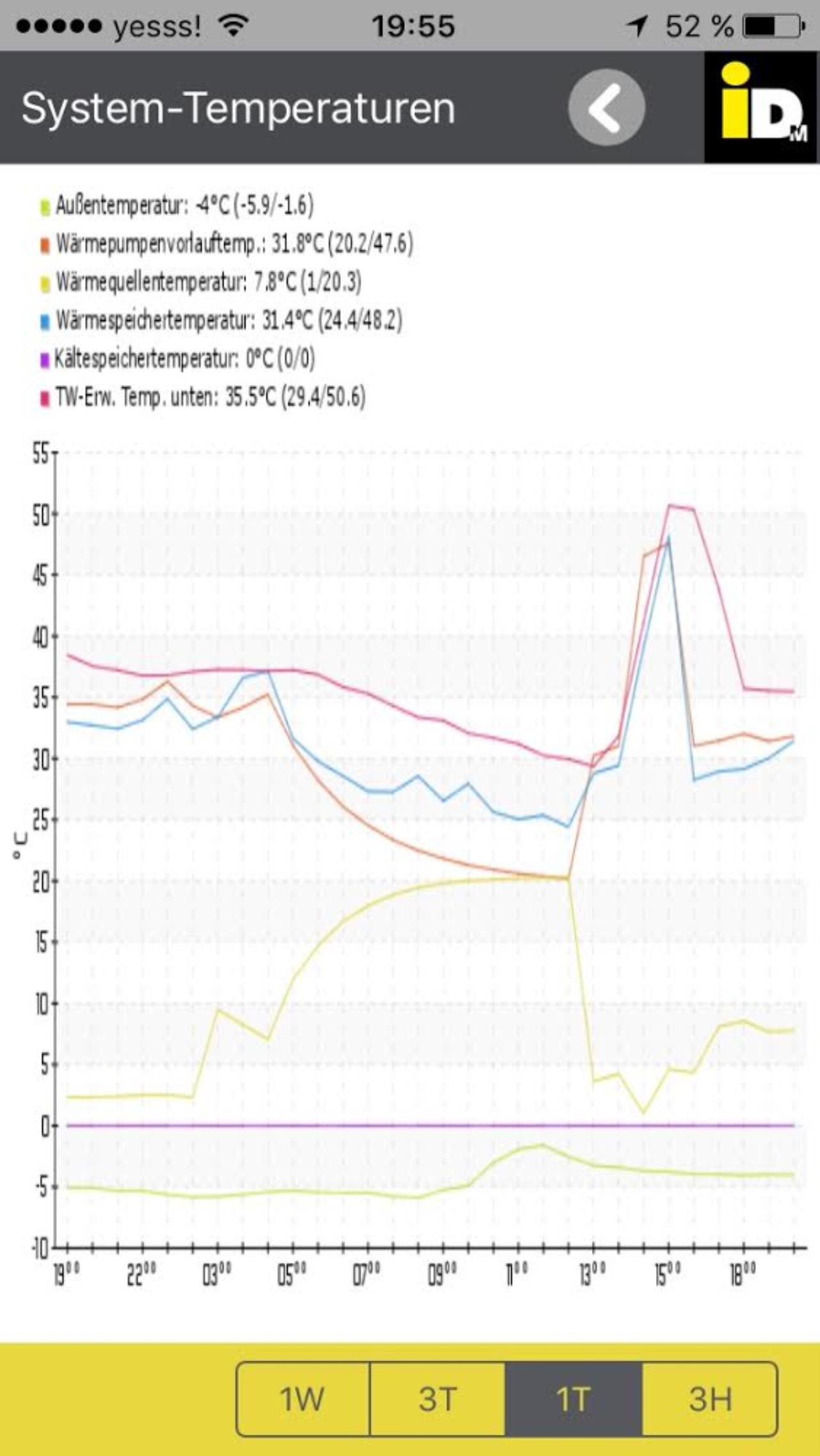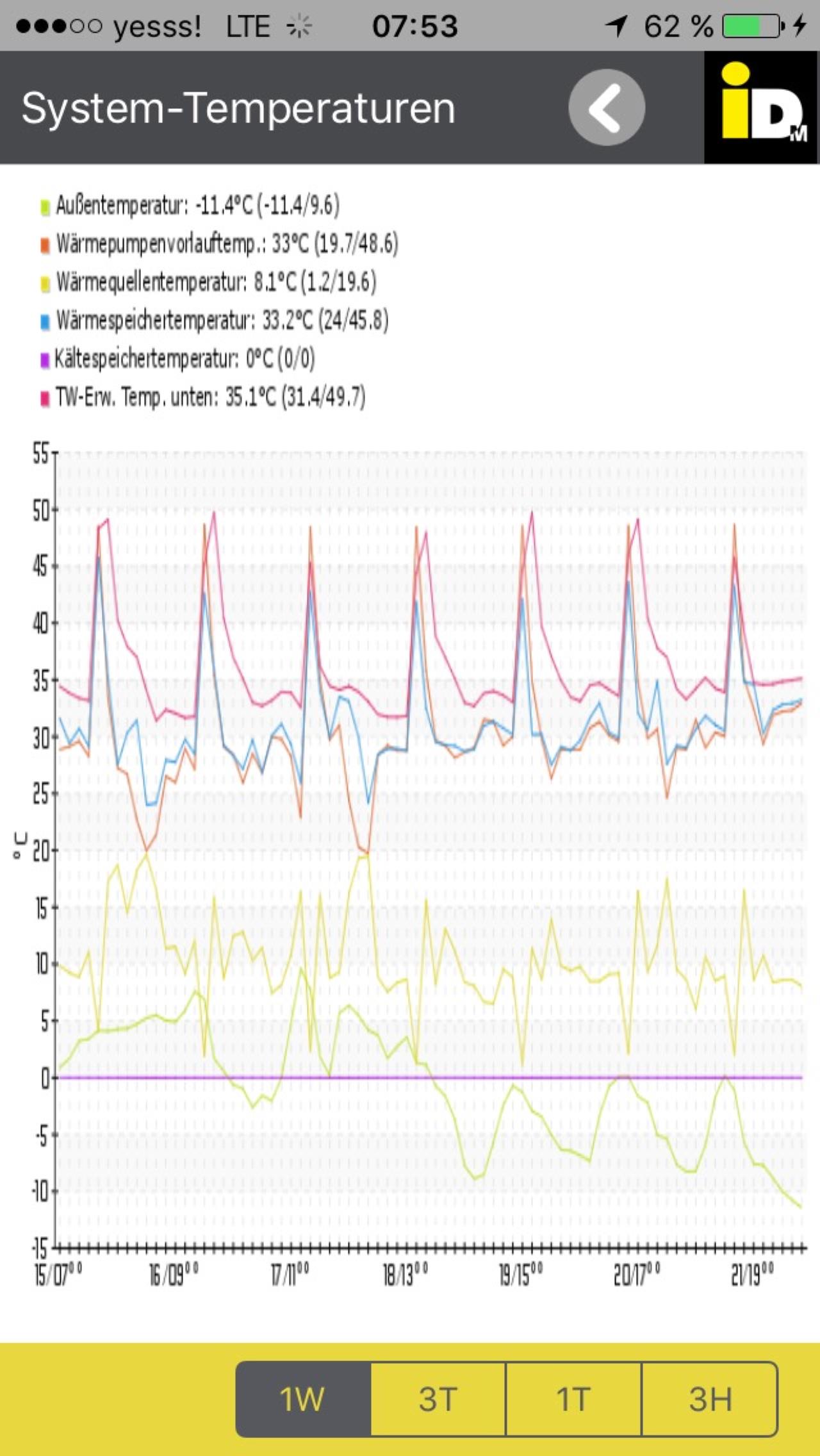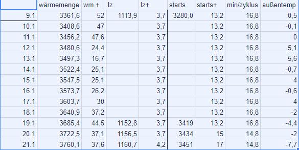 (Baby baden um 17.00) Da eben diese Regelung wieder aktiv ist, hat es von 04:00 bis 13.00 die WP WP [Wärmepumpe] nicht geworfen. Es war zwar immer wieder die Anforderung da, aber nie länger als 15min (Einstellungen Wartezeit). Von gestern auf heut: wärmemenge+ +45,2 lz+ 5.0 starts+ 18 min/zyklus 16,7 Da is nix verbessert. Eher mehr Energie, weil es länger abgesuckt is. HK auf 0.4 |