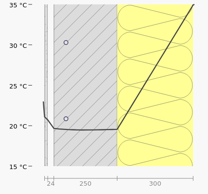 dT, 5K schön wär's. Nehmen wir an die Vorlauftemperatur beträgt 18°C und die Rücklauftemperatur 20°C. Somit wäre die mittler Fluid-Temperatur bei 19°C. Ich habe jetzt mein Haus als Referenz herangezogen, mit 30 cm 027 XPS ist das Dach damit sehr gut isoliert. Bei einer mittleren Fluid-Temperatur von 19°C beträgt die Oberflächentemperatur der Decke 21°C (Raumtemperatur 23°C). Der Wärmestrom nach innen wäre damit -18,7 W/m², jener nach außen aufgrund der guten Dämmung -1,3 W/m². Aufs Haus gerechnet würde die Kühlleistung bei diesen Parametern bei ca. 4,6 kW liegen. |