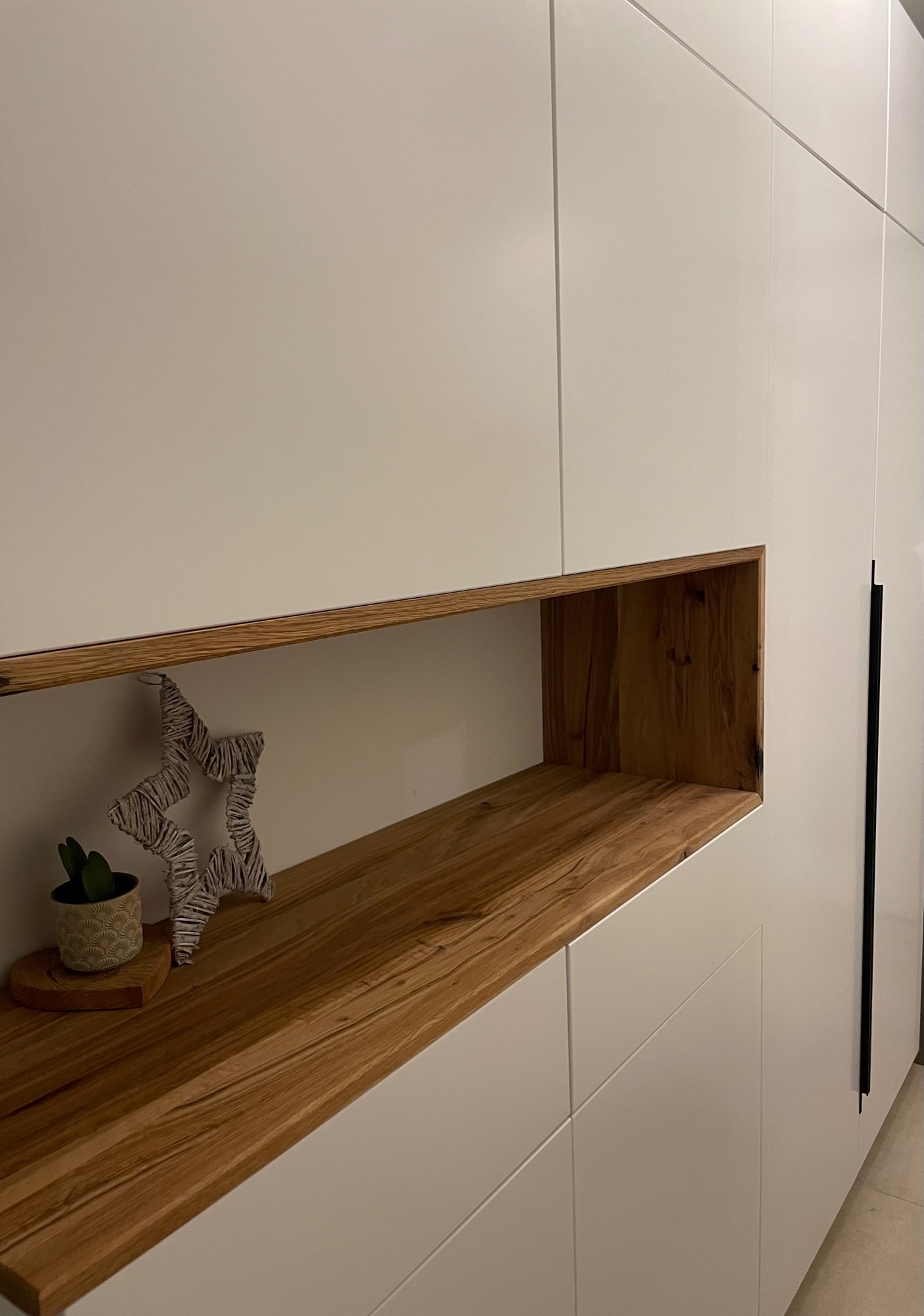 Gefunden. Lessons learned: - Aussenschubladen bei Hängeschränken die man als "Unterschrank" verwendet, müssen gemoddet werden damit sie auch oben passen - Schienen echt brauchbar wenn man sie immer ganz oben verwendet. Dazwischen bzw. Korpusse am Boden aber direkt befestigt. - Schneiden mit 60er Zähne Blatt ohne abkleben oder sonstiges -> super saubere Schnittkanten - Eiche passt gut zu Veddinge und Upplöv. Auch gleich zwei alte Deckenlampen gemoddet damit sie dazupassen - Griffleisten von anderen Anbietern passen, sofern sie nicht >1,5mm sind - Hjälpa Innenkleiderstange aus der Platsa Serie passen, müssen aber vorher 3cm gekürzt werden. - Veddinge bei Preis/Leistung sehr gut - Aufpassen beim Tiefe kürzen, Seiten/Böden sind unterschiedlich tief (2mm Unterschied, sonst passt die Nut nicht die man neu setzen muss, Nut fräsen/schneiden mit Formatkreissäge easy) - Rückwand mit Cuttermesser am saubersten zum Ausschneiden (bei uns der E-Verteiler im Korpus versteckt) Stichsäge etc. machts nur komplizierter - Die Hotline is das Schlimmste... - PAX, PLATSA etc. kannst zum hacken mittlerweile vergessen PS: Bin auch grad an einem neuen Ikea Metod Hack drann fürs WZ. 😬 |