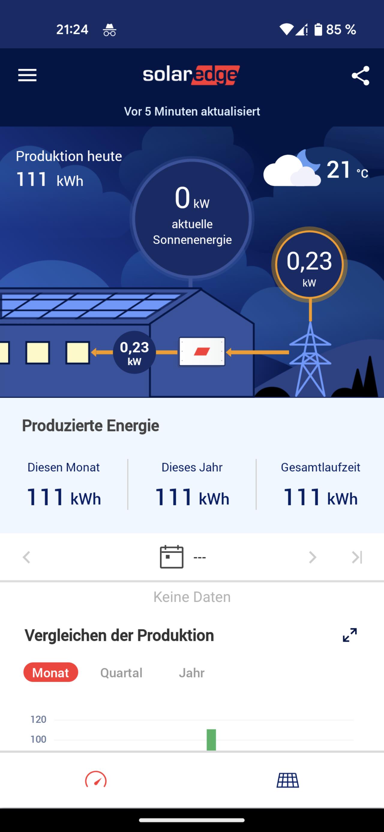 hab seit heute auch die mysolaredge app in verwendung. wieso seh ich keinen verlauf der tagesproduktion? kann das am zweiten SE-smartmeter liegen der den zusätzlichen fronius symo erfasst? bei mir sieht es momentan so aus. edit: im monitoring am PC sind alle diagramme vorhanden. |