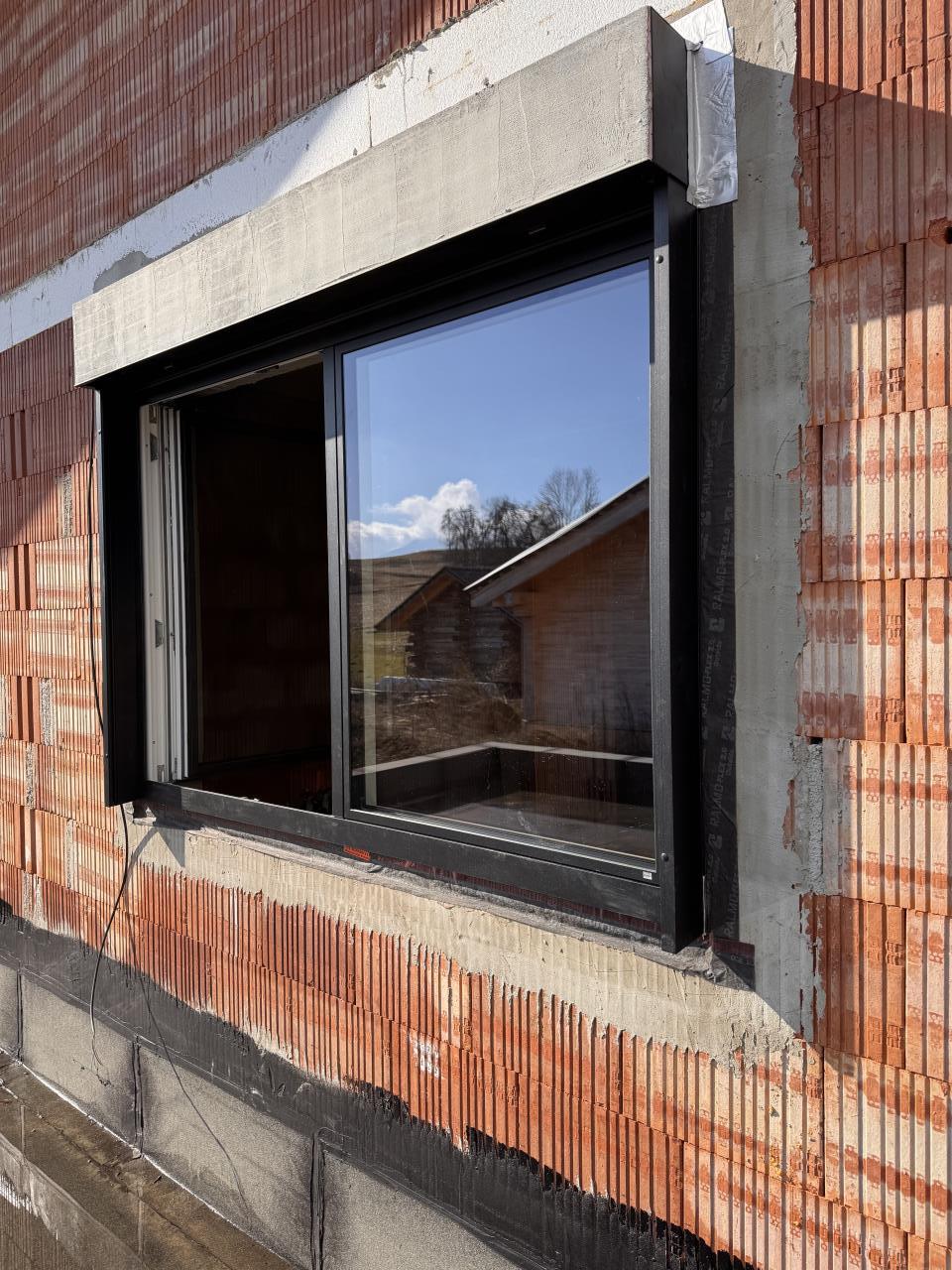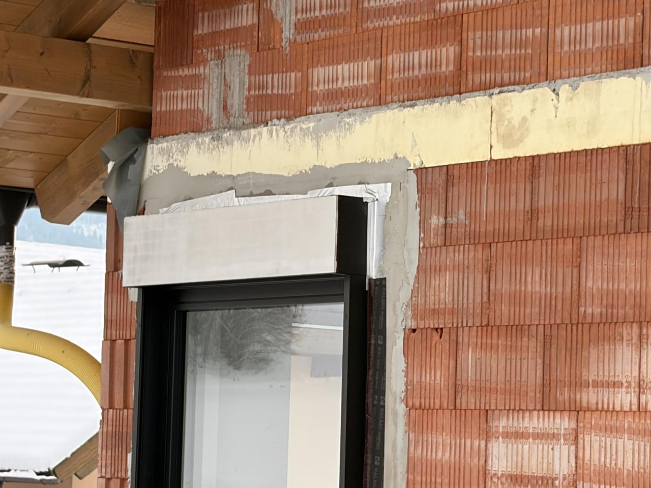Ja Wärmebildkamera hatte ich bis jetzt leider keine, ist aber eine am Weg zu mir. Ist sicher immer wieder nützlich. Das seltsame ist, das Fenster am letzten Foto im vorherigen Post hat keine Raffstores und auch keinen Insektenschutz oder ähnliches. Die Raffstore Schienen werden aber komplett mit der Fassade überdämmt. Anbei sind noch zwei Fotos von außen vom März 2025, nachdem die Fenster eingebaut wurden. Wobei mir letztens als ich am Flachdach war, mir bei einem Fenster diese nassen Flecken bei einem Fenster aufgefallen sind. Das Alu Klebeband hat der Fensterbauer damals dort als Wetterschutz geklebt, damit es nicht hinten hineinregnet solange die Fassade noch fehlt. |