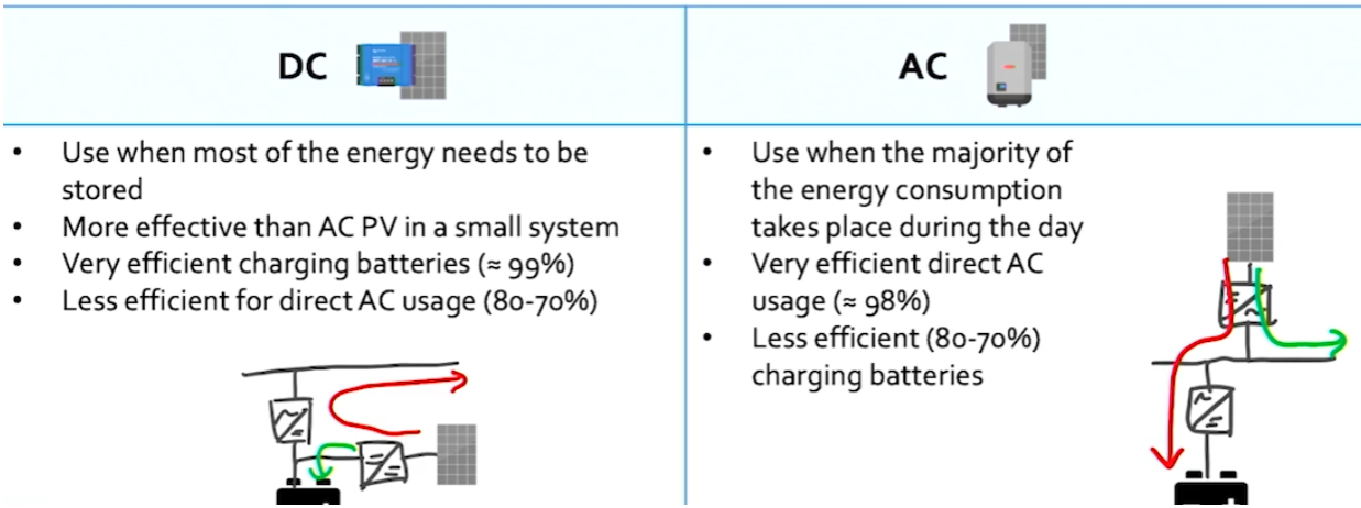 hätt ich eher gemeint, ja. Weil da hast 2 Tracker. 1x Ost, 1xWest Wird nicht der Mega-Vorteil sein, aber schon ein bissl. Außerdem höhere Spannung, was auch ein Vorteil sein sollte. DC-Seite kann nicht "zu viel" für einen Multi sein. Da ist die Batterie das Limit. Der kleine Multi ist nur der Flaschenhals, wenn du viel Leistung aus der Batterie oder vom MPPT MPPT [Maximum Power Point Tracker] Richtung Haus(=AC) schicken willst. ich mag ja deinen Victron-Enthusiasmus, aber nichtsdestotrotz ist meist eine Mischung aus AC-WR (Fronius od. SE) und DC-Laderegler (Victron MPPT MPPT [Maximum Power Point Tracker]) das Optimum: wenn du untertags, wenn die Sonne scheint auch den meisten Verbrauch hast, wär ein AC-WR schon besser. Da vielleicht in die vorgeschlagenen SE-Richtungen denken, und evtl. nur einen recht kleinen MPPT MPPT [Maximum Power Point Tracker] für ein paar Module installieren. Gerne auch erst später nachrüsten. Wenn du aber die Sonnenenergie eher Abends nutzen willst, oder den Notstromfall in den Vordergrund stellst, dann ist die reine DC-PV-Lösung die Richtige. Ich habs eh schon mal gesagt: Eigentlich wärs heutzutage eh schon sinnvoller, wenn das komplette Haus nur auf DC läuft und nur die Netzversorgung bis zum Hausanschluss auf AC. Vielleicht wird das mal standard in den nächsten Jahrzehnten?!