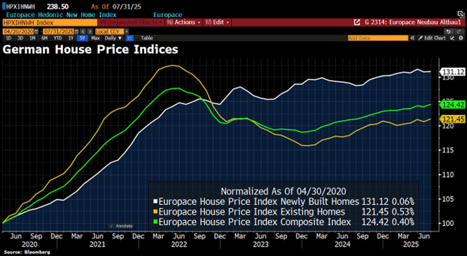 Juli-Update aus Deutschland - starker Preisaufschwung (vor allem in den Ballungsräumen) speziell bei bestehenden Häusern (+0,6% zum Vormonat). Der Gesamtindex stieg im Vergleich um 0,4%, Neubauten um 0,1%. Das knappe Angebot und die Befürchtung wieder steigender Zinsen schlagen sich am Markt nieder. |