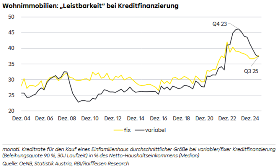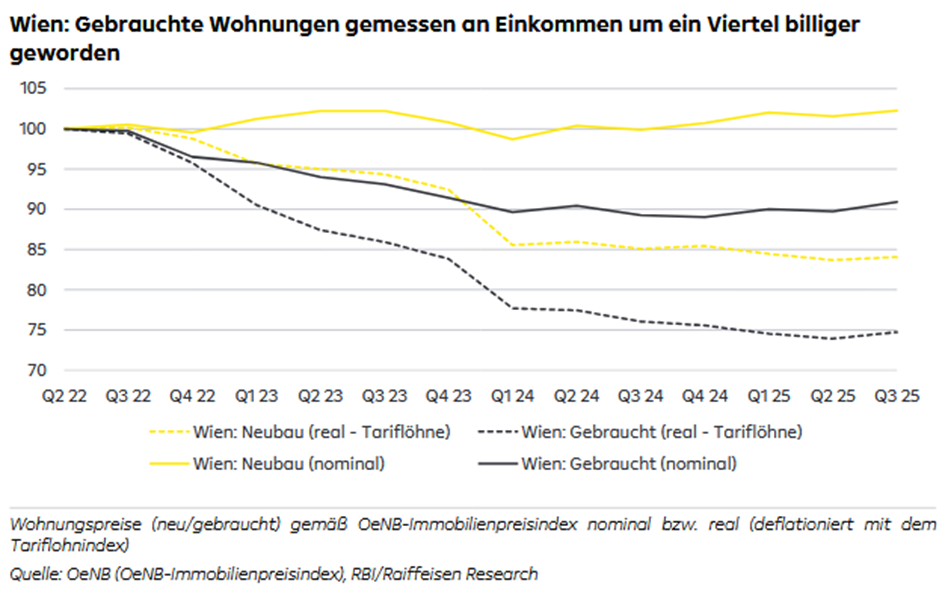 hier zahlt es sich aus, auf die Bezugsgröße des Rückganges zu achten - nicht inklusive Inflation sondern „Gemessen am Einkommen sind gebrauchte Wohnungen in Wien heute um ein Viertel billiger als Mitte 2022“ (Mitte 2022 als Ausgangspunkt deshalb, da hier die Belastungen durch Zinssteigerungen und KIM-V mehr oder weniger gleichzeitig begannen) Das Einkommen wird in der Analyse über die Tariflohnentwicklung definiert (die sich in Ö im internationalen Vergleich der vergangenen Jahren überdurchschnittlich positiv gestaltet hat) ... ... und daher neben dem sich wieder normalisierten Zinsumfeld nun auch die Leistbarkeit für Immobilienfinanzierungen deutlich verbessert hat: Aus der obigen Analyse lässt sich festhalten: "Seit dem Aufkommen des doppelten Gegenwinds (Q3 22) sind Neubauwohnungen in Wien um 1,7 % teurer geworden, im Rest Österreichs sogar um 8 %. Die Preisrückgänge auf dem Gesamtmarkt (neu und gebraucht) haben daher ausschließlich im Gebrauchtsegment stattgefunden, wo Wohnungen in den letzten drei Jahren um 8,9 % (Wien) bzw. 5,3 % (Ö exkl. W) billiger geworden sind. Die preisliche Schere zwischen Neu- und Gebrauchtsegment ist also auseinandergegangen, seit Corona sind Neubauwohnungen abseits der Bundeshauptstadt verglichen mit Bestandseinheiten um 18 % teurer geworden. In Wien liegt der „Preisaufschlag“ bei 12 %." |