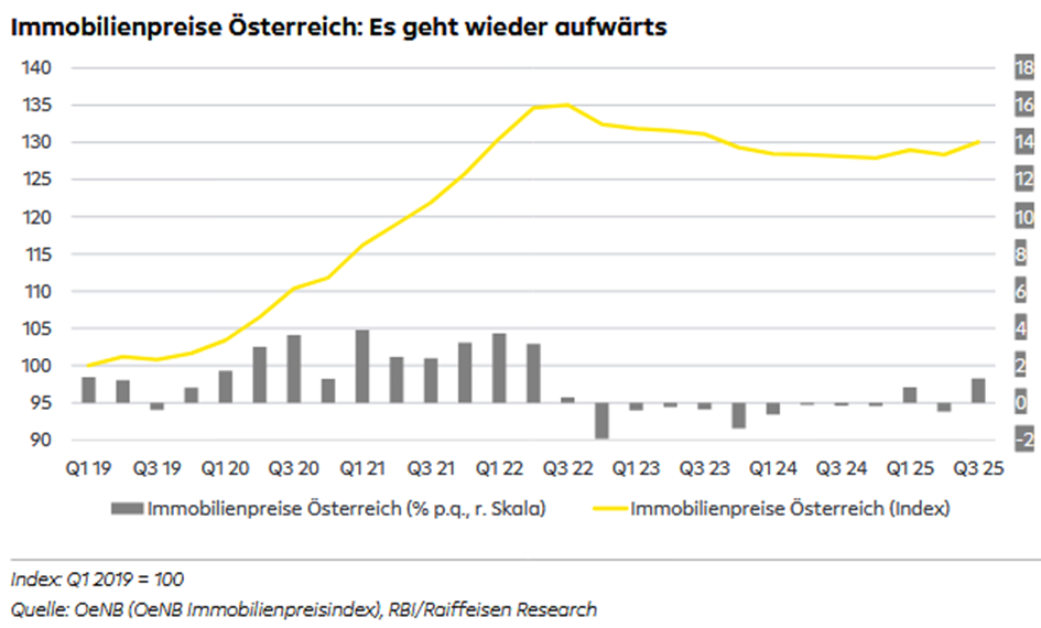 Den Inhalt von Raiffeisen hatten wir so, vor ein paar Wochen, doch schon einmal. "Seit dem Jahresbeginn 2025 ist Wohneigentum damit um 1,7 % teurer geworden. Im Gesamtjahr 2025 rechnen wir mit einem österreichweiten Preisplus von 0,9 % (Q4 2025 noch ausständig)." Was ja bedeutet, dass es in Q4 zu einem Rückgang der Preise (ca -0.8%) kommen sollte. Im Text findet man dazu nichts. Der Text suggeriert weiter steigende Preise. |