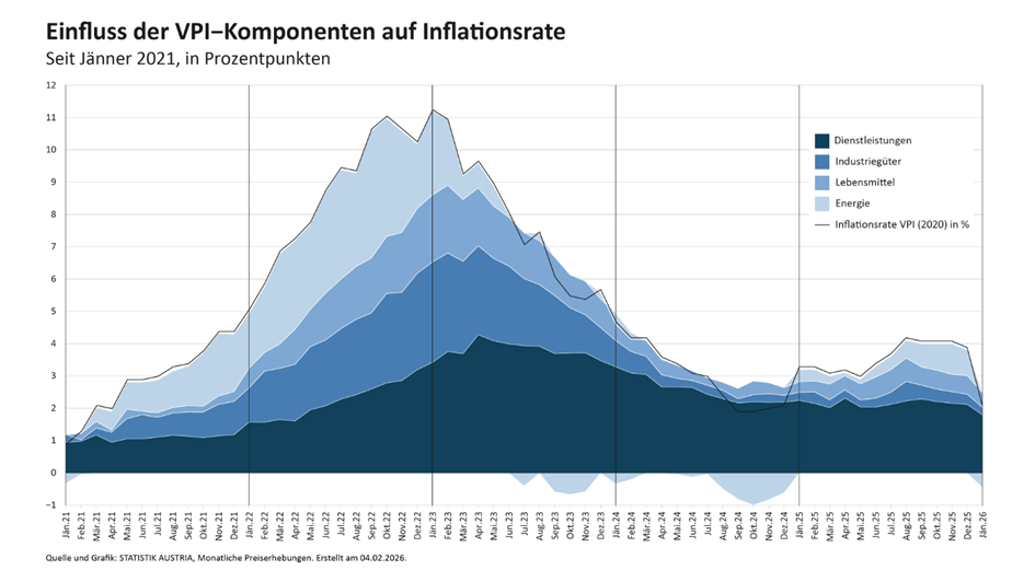 absolut richtig ergänzend auch der Vergleich mit Deutschland (freilich auch mit einem überwiegenden Dienstleistungsanteil an der gesamtwirtschaftlichen Produktion). Der Grund für den deutlichen Rückgang im Jänner 2026 liegt u.a. natürlich auch im hohen Inflationswert des Jänner 2025 (nach dem Auslaufen der Strompreisobergrenze Ende 2024). Dieser einmalige Effekt ist diesen Jänner nun weggefallen, wodurch auch dadurch die Preissteigerung merklich gesunken ist. |