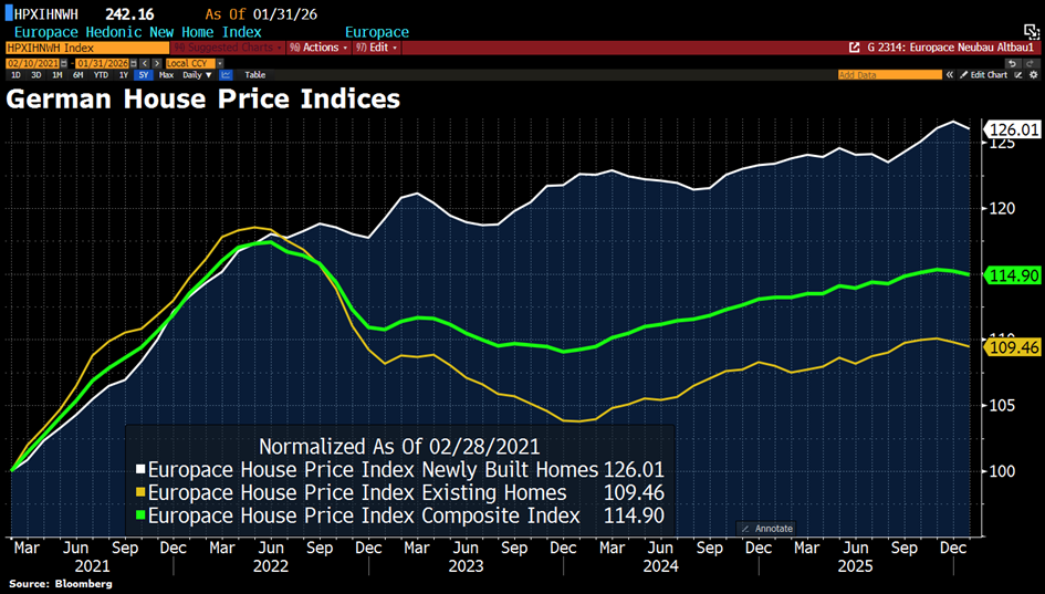 Ein diesmal anderes Bild zeigt der Deutsche Europace Hauspreisindex im Jänner: Im Vergleich zum Dezember sank dieser (vorrangig bedingt durch den Rückgang bei Bestandsimmobilien) um 0,27% und somit so stark wie seit 2023 nicht mehr. Gründe dafür liegen in den zuletzt gestiegenen Hypothekenzinsen. Als Gegenpol wirken allerdings die wieder einmal gestiegenen Mietkosten (Vergleich zum Dezember + 0,7%), die eine Unterstützung für Eigentumspreise lieferten.