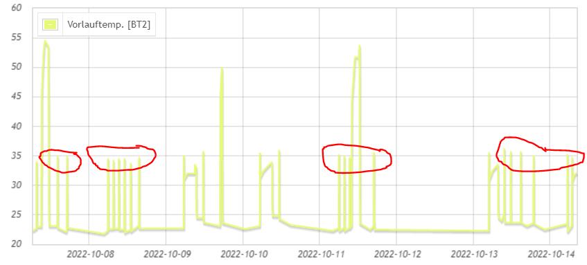 Hallo Nibe-Fans! hier ein Update meinerseits, leider hab ich noch von niemand eine Rückmeldung/Info/Tipp erhalten ... HILFEEEE - was macht meine WP WP [Wärmepumpe] da? Warum geht die VL VL [Vorlauf]-Temp so oft kurz rauf? Ein Fühler/Sensor defekt? Danke! Harald |