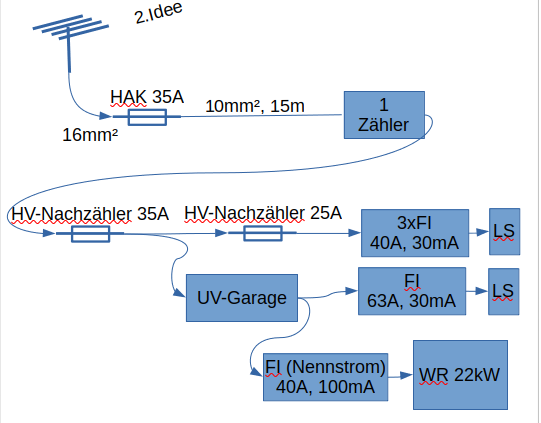 Die Idee funktioniert schon, nur müssten dann beide HV-Nachzähler 25 A sein. Was natürlich blöd ist wegen dem 22 kW WR WR [Wechselrichter]. Dass du die 16mm² nicht einziehen willst verstehe ich, sehe aber momentan keinen Weg daran vorbei. Gibt Schlimmeres als glatte 40er Rohre und ich denke du bist froh wenn du es nach dem Stand der Technik gebaut hast. |