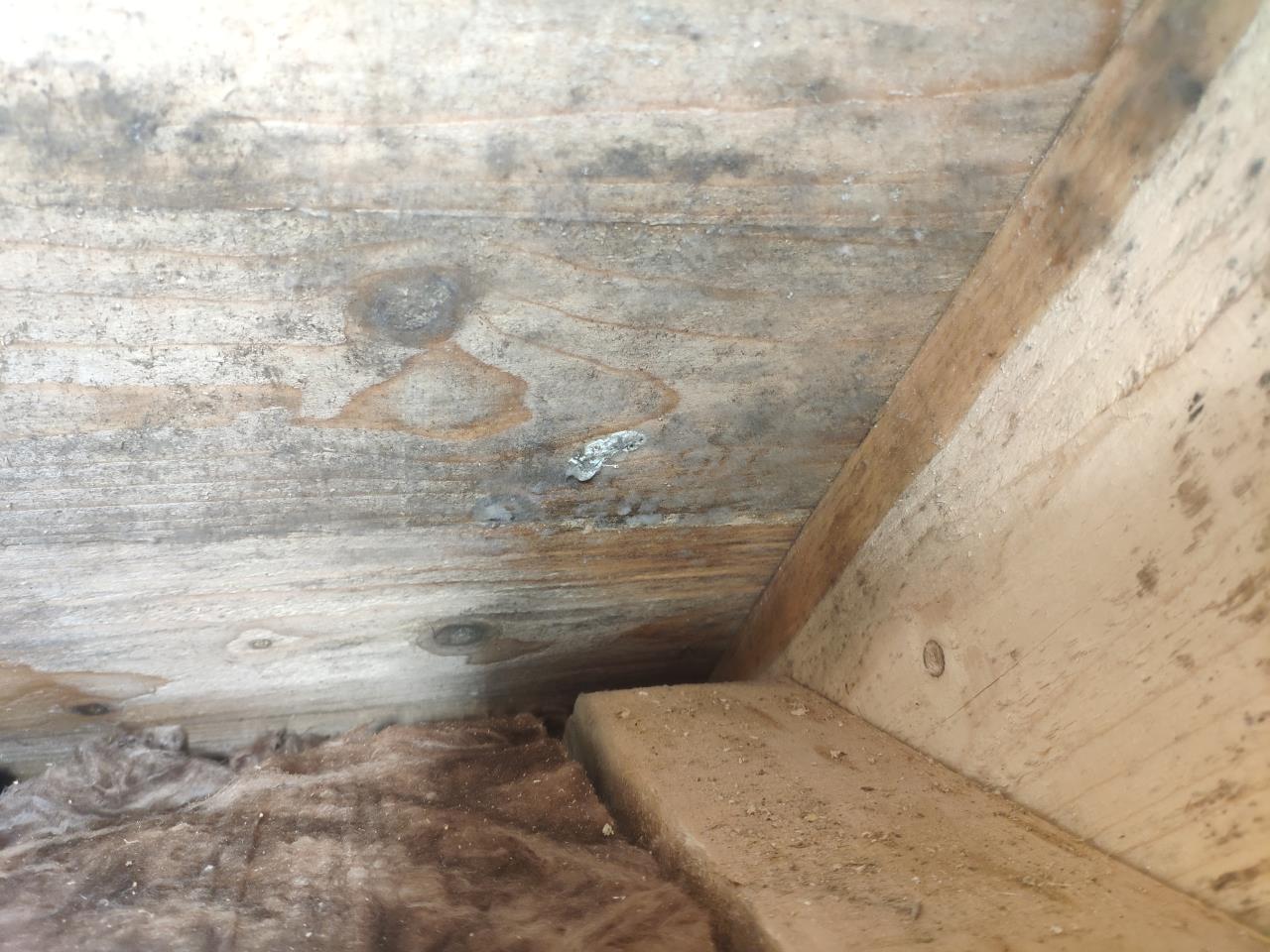 Wir haben eine leichte Schimmelbildung an der Rauschalung am Dachstuhl am Übergang von der Zangendecke zu den Sparen (siehe Bild).