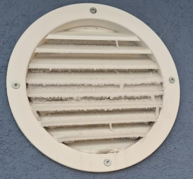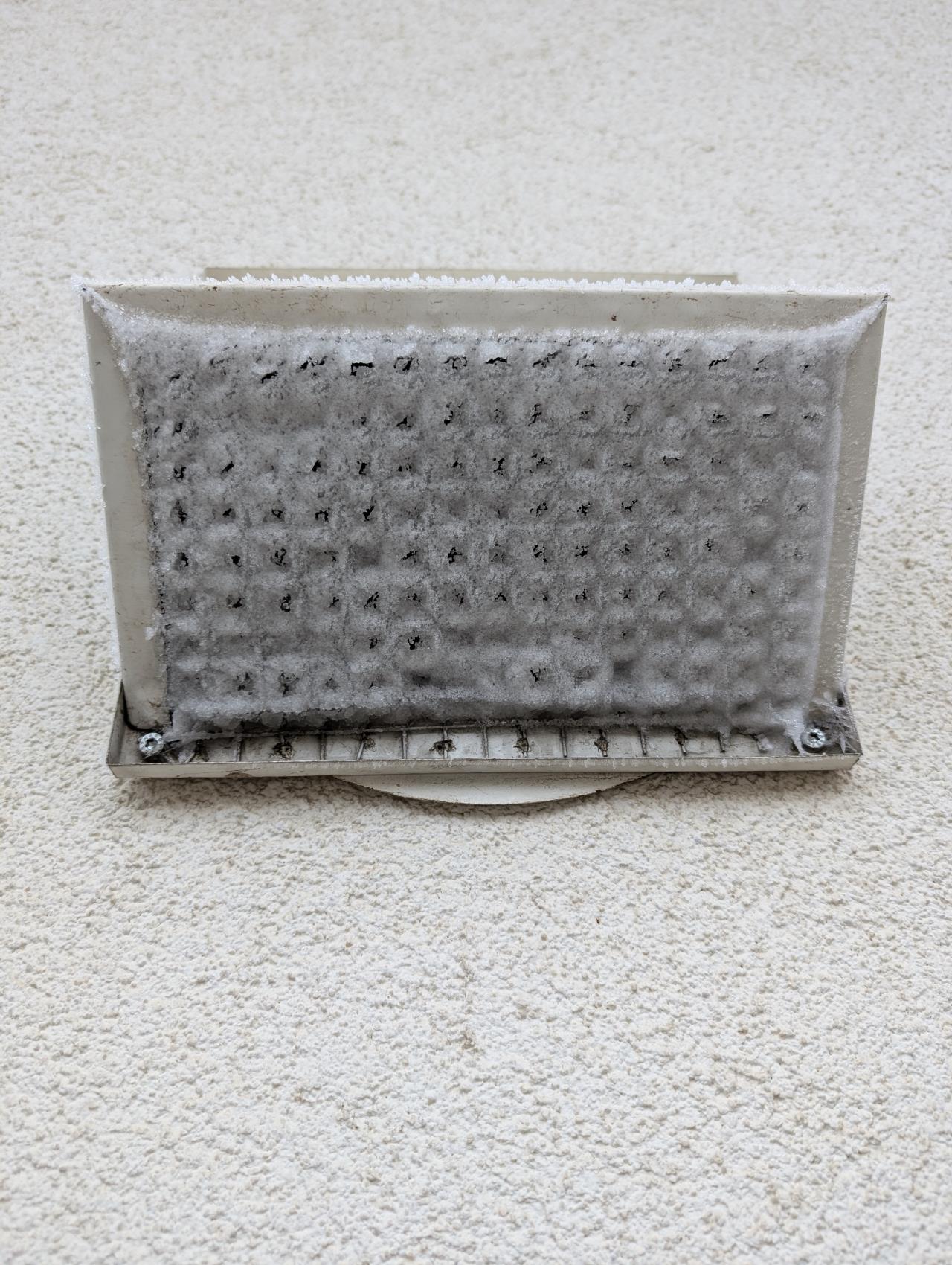 Ich habe das das Metall Ansauggitter gegen ein Nylon Sieb getauscht und eine Haube drüber gebaut. Eigentlich weil meine KWL KWL [Kontrollierte Wohnraumlüftung] bei Schneegestöber sich damit vollgesaugt hat. Seitdem hatte ich auch kein zufrieren mehr. Der Nebel friert da nicht fest weil die Oberfläche viel größer ist und der Kunststoff nicht so kalt wird wie Metall.