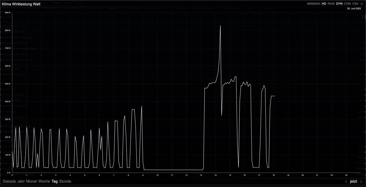 Das stimmt schon, aber untertags steht ev. das Aussengerät teilweise in der Sonne, das zeigt dann schon mal 45° Aussentemperatur an. Hier ein typischer Tagesverlauf vom Stromverbrauch mit einem aktiven Innengerät auf geringster Stufe. |