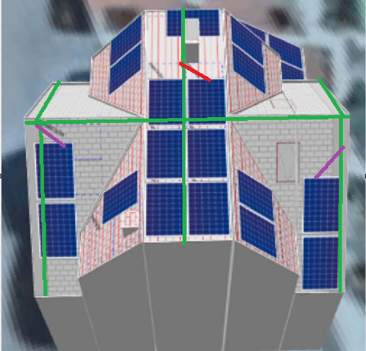 Hallo, hab eine ähnlich Frage, hoffe ihr könnt mir kurz helfen: Hab ein Reihenhaus mit Gaubendach und letzte Woche eine PV Anlage (zumindest einmal die Montage der Module) bekommen: Den bestehenden Blitzschutz habe ich grün eingezeichnet. Die PV Module bzw. die Unterkonstruktionen sind untereinander alle mit einer 16² Erdung verbunden die dann im Keller am Potentialausgleich hängt (hab ich jetzt nicht extra eingezeichnet). Nachdem ja jetzt der Sicherheitsabstand zw. PV Erdung und Bitzschutz nicht eingehalten wird, muss man ja die PV Erdung mit dem Bitzschutz verbinden (soweit ich das jetzt verstanden habe). Hoffe soweit alles richtig? Meine Frage jetzt: Reicht die Verbindung zw. PV Erdung und Blitzschutz zentral einmal (rot eingezeichnet), oder muss man das mehrmals verbinden (z.B. auch bei den seitlichen Modulen, lila eingezeichnet). Also reicht ein zentraler Potentialausgleich zw. Blitzschutz und PV Erde (weil ja die PV Erde sowieso auch untereinander mit 16² angebunden ist) oder nicht? |