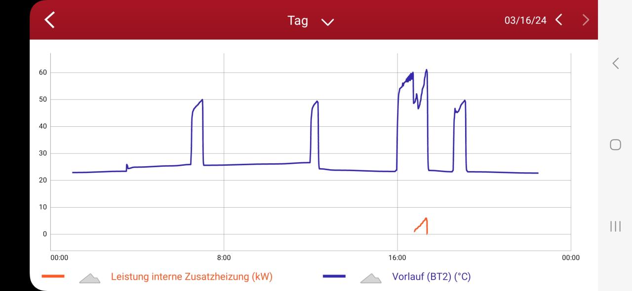 steht bestimmt im manual, was dann genommen wird. kannst da ja mal die maximale Temp etwas absenken, sodaß der VL VL [Vorlauf] unter 60C bleibt. kann sein, daß das in den infomeldungen steht, oder n alarm kommt. halt beobachten. hast du vielleicht die maximale pumpleistung begrenzt? bei meiner gilt das für heizen und für WW WW [Warmwasser]. stell ich da 80% ein, hat das auch einfluss auf den durchfluss bei WW WW [Warmwasser]. kannst ja mal zeigen, was der durchfluss/die pumpe gemacht hat, als der heizstab anging. |