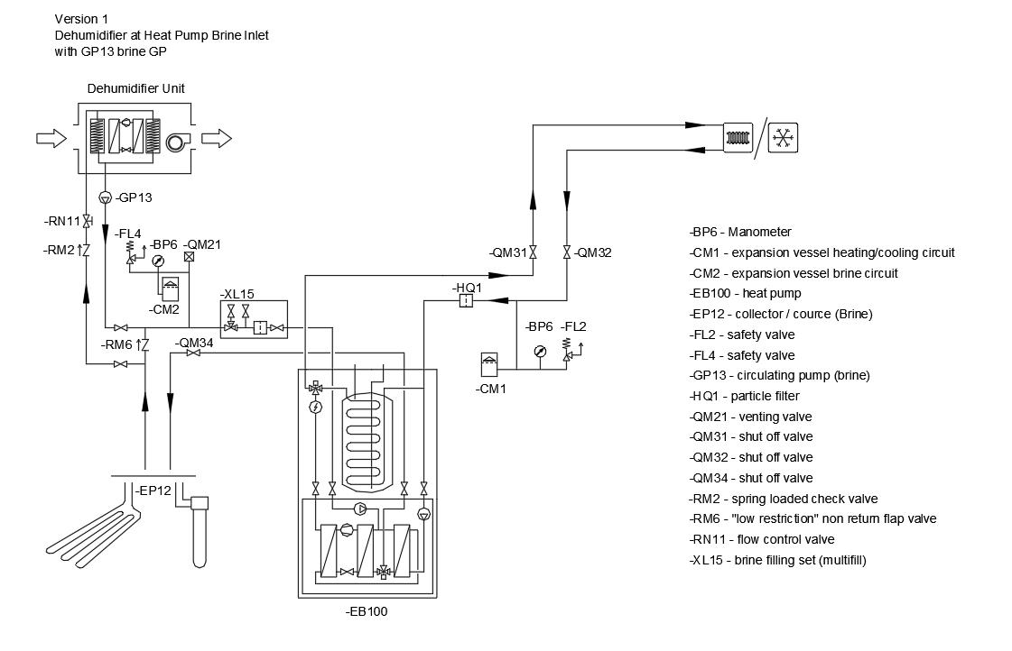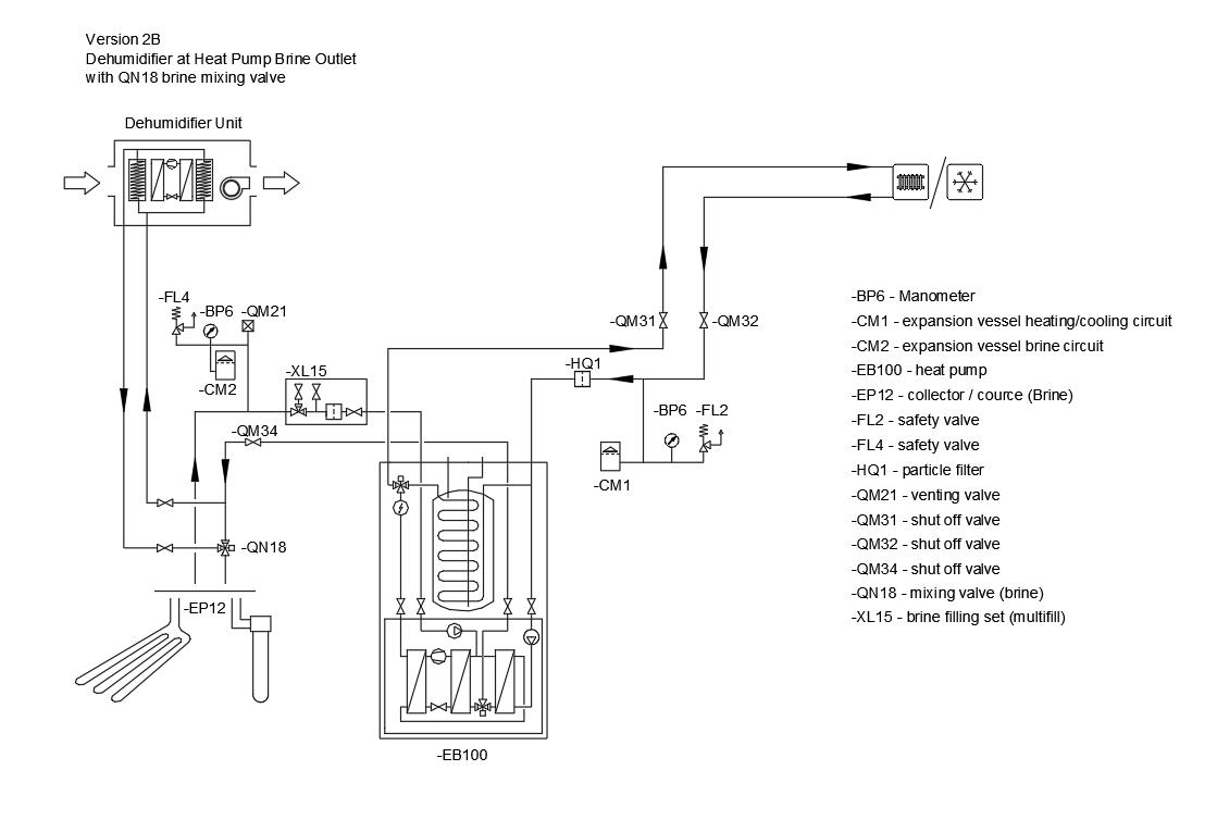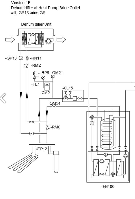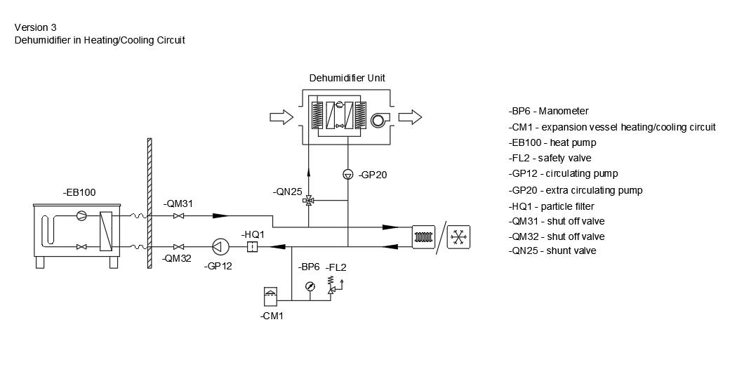 nein, so geht es nicht, dann würdest du das Entfeuchtungsmodul parallel zur Kältequelle setzen. Es muss stattdessen in Serie geschalten sein. Wenn die Quelle kalt genug ist, dann kann das VOR der WP WP [Wärmepumpe] passieren: Hier wird ein Teil der Sole erstmal durch den Entfeuchter geleitet und dort erwärmt und fließt dann durch die WP WP [Wärmepumpe]. Das kann bei DWF und HRDS Geräten sinnvoll sein, weil die bringen bessere Leistung mit kälterer Sole-Temp. Durch das Aufwärmen der Sole bleibt aber etwas weniger Kühlleistung für die Flächenkühlung übrig. Diese Variante ist somit eher nur für Tiefenbohrungen, Grundwasser oder kalte, großzügige Quellen zu empfehlen. Hydraulik Version 1: Eingebunden wie ein Nibe FLM Modul. Also mit einer zusätzlichen kleinen Solepumpe und einem Rückschlagventil: (Info: diese Variante ist mittlerweile auch schon von KNV freigegen worden) So kann die Entfeuchtung komplett unabhängig angesteuert werden. Einfach bei Entfeuchtungs-Bedarf die Zusatzpumpe einschalten. Hydraulik Version 1b: Wenn die Kühlleistung Vorrang haben muss, kann das Entfeuchtungsmodul stattdessen auf der Sole-Auslass-Seite platziert werden. Das bietet sich auch bei HRDS+ Geräten an, weil hier die Sole-Temperatur für den Entfeuchtungsvorgang quasi egal ist. Hydraulik Version 2: Weil Zusatz-Solepumpe und Rückschlagventil auch Geld kosten und das System komplizierter machen, gibt es auch eine Variante ohne Zusatzpumpe, nur mit einem stetigem 0-10V Mischerventil. Dies ist allerdings keine unkritische Lösung. Hier muss der Mischer extern geregelt werden. Und zwar muss dieser beim Entfeuchtungs-Vorgang auf eine vordefinierte min. Stellung öffnen, um den min. Durchsatz durch den Entfeuchter zu gewährleisten. Der Mischer darf aber nicht voll öffnen, um nicht den Sole-Durchsatz durch die WP WP [Wärmepumpe] zu sehr zu drosseln. Es müssten bei der Inbetriebnahme diese min. und max. Mischerstellungen festgelegt werden. Dazwischen darf man sich bewegen und so die Entfeuchtungs bzw. Kühlleistung regeln. UND: die Wärmepumpe muss die Möglichkeit bieten, die interne Sole-Pumpe auf Knopfdruck erzwingen/aktivieren zu können. (z.B. Aux-Eingang oder Modbus) Also kurz um: im Grunde die "simplere" Lösung seitens Hardware, allerdings nur für Leute zu empfehlen, die auch wissen was sie tun! Hydraulik Version 2b: gleiche Variante, nur auf der Sole-Auslass-Seite platziert: Hydraulik Version 3: Alternativ zur Sole-Seite, kann das Entfeuchtungsmodul auch auf der Heiz/Kühlkreis Seite platziert sein. Für LWP LWP [Luftwärmepumpe] geht es natürlich nur mit dieser Variante. Das hat den Vorteil, dass das Entfeuchtungsmodul im Winter auch zur Heizungsunterstützung eingesetzt werden kann. (warmes Heizwasser wird durch die Register geleitet und erwärmt die KWL KWL [Kontrollierte Wohnraumlüftung]-Zuluft) Nachteil: während WW WW [Warmwasser]-Bereitung ist hier kein Entfeuchten möglich, (weil kein kühler Wasserdurchsatz durchs Modul gegeben ist)