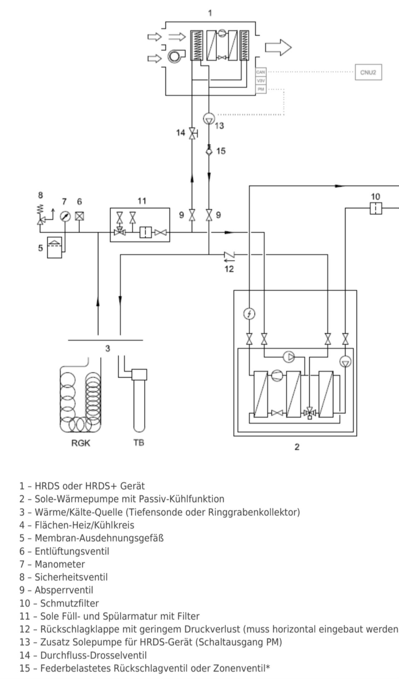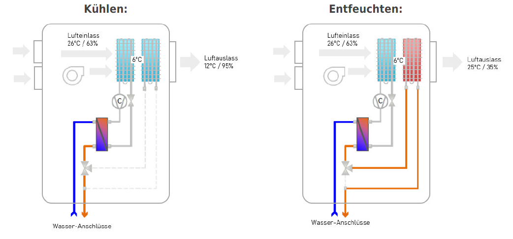 damit wird die Zuluft dann gekühlt und nicht geheizt. Allerdings nur wenn man das so will. Ob Durchfluss im Entfeuchterkreis vorhanden ist oder nicht, kann eingestellt werden. Es kann dazu eine eigene Pumpe und/oder ein Zonenventil angesteuert werden. Damit kann man selbst einstellen/kontrollieren ob die Lüftung mitkühlen soll oder nicht. (oder im Winter mitheizen soll, wenn auf der Heizkreisseite integriert)