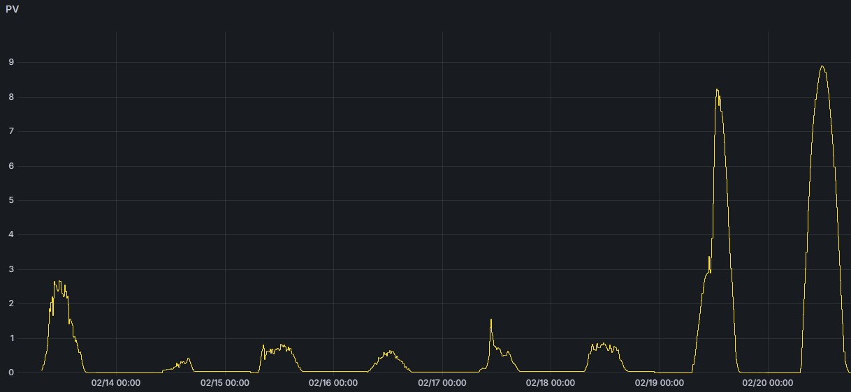 Etwas "Schnee" Feedback. Insgesamt gabs dieses Jahr 2x Schnee, aber immer nur so 5cm. Auf anderen Dächern ist der etwas "bogenförmig" runtergerutscht, nur von den Klemmen gebremst, bei unserem Dach lag der Rest halt linienförmig an der unterkante vom Modul. Scheint also etwas mehr zu bremsen, allerdings war der Unterschied nicht so, dass die anderen Dächer mit ähnlicher Neigung früher wesentlich schneefreier gewesen wären. Hätt wohl etwas mehr Schnee gebraucht, dass alles in einem Rutsch runterkommt. Dazu kam, dass der halb abgerutschte Schnee dann 4 Tage lang durch -10° in der Nacht und tagsüber Mistwetter kaum über 0 noch fixiert wurde. Da wars aber so dunkel, dass eh kaum Strom gekommen wär. Tag 6 bei blauem Himmel hats dann bis ca. 11 gedauert, dann war der Schnee weggetaut. Ganz links ein durchschnittlicher Mistwettertag, dann der Schneetag + 4 Mistwettertage mit Schneeresten, dann der erste Tag mit blauem Himmel und ganz rechts blauer Himmel und schneefrei. |