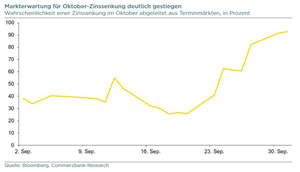 Weltweit wurden Spar- und Investitionsanstrengungen nie gleichzeitig unternommen - ebenso wie die Zinslevels weltweit unter den Volkswirtschaften nie gleich waren. Gerade die großen Währungsblöcke agierten hier stets höchst unterschiedlich - einfach, weil das jeweilige Zinsniveau auch ein Resultat des jeweiligen Inflationsgefüges war/ist/sein wird und nicht der Verschuldung. Auch beispielsweise auf Ebene der privaten Haushalte. US-Haushalte sparen im Vergleich zum Durchschnitt der Jahre vor der Pandemie weniger, während die Haushalte der EUR-Zone vergleichsweise höhere Sparraten aufweisen ... bei deutlich höherem Zinsniveau des USD (und Schuldenstand der USA) gegenüber dem EUR: Die historischen Zeitreihen sagen auch für Österreich jedenfalls etwas anderes. Die öffentliche Verschuldung (im Verhältnis zum BIP) lag beispielsweise 1980 bei 35,4% bei einer Neuverschuldung (im Verhältnis zum BIP) von 2,1% --> Sekundärmarktrendite Bundesanleihen 9,19%. 1990: 56,1% zu 2,6% zu 8,74%, 1995: 68,3% zu 6,2% zu 6,48%, etc. Auch in Phasen niedrigerer Neuverschuldung (z.B. 2001: 66,7% zu 0,6% zu 4,62%) lag das heimische Zinsniveau teilweise deutlich über jenen Phasen, in denen die Neuverschuldung (z.B. 2004: 65,2% zu 4,8% zu 3,41%) sehr hoch war. Quellen https://www.wko.at/statistik/Extranet/Langzeit/Lang-Fiskalindikatoren.pdf bzw. Für die kommende EZB-Sitzung am 17.10. gibt es marktseitig eine mittlerweile sehr ausgeprägte Erwartungshaltung: |