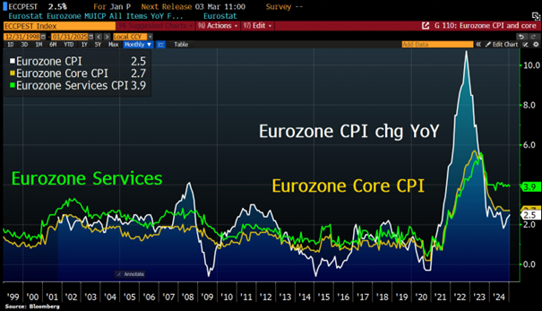 unerwartete Steigerung der Jänner-Inflationsrate in der EUR-Zone auf 2,5% (von 2,4% im Dezember). Die Kernrate (ohne Energie- und Lebensmittelpreise) blieb stabil hoch bei 2,7%. Der Dienstleistungsbereich ging von 4% auf 3,9% zurück.