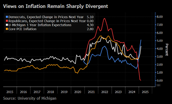 interessant und passend dazu die stark gestiegene Inflationserwartung in den USA (und jene der beiden großen politischen Lager, die unterschiedlicher nicht sein könnte) - erhoben durch die traditionelle Verbraucherbefragung der Uni-Michigan.