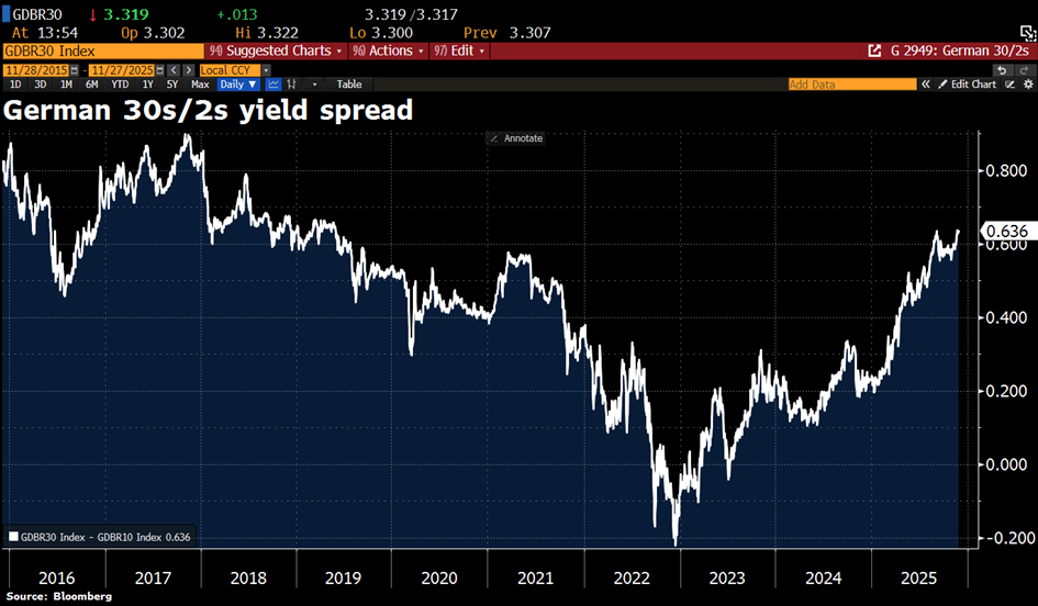 Die Zinskurve nimmt einen weiteren Anlauf zur "Versteilerung". Der Verschuldungsdruck wird von den Märkten entsprechend eingepreist. Der Abstand zwischen 30Y und 2Y deutschen Staatsanleihen befindet sich auf dem höchsten Stand seit 2019: |
