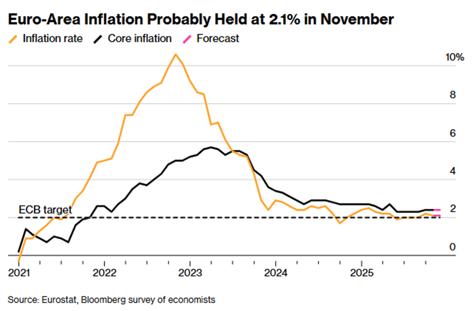 November-Inflation in Deutschland weiterhin deutlich über EZB-Zielmarke: Headline-Inflation 2,3% (unverändert), Kerninflation 2,7% (2,8% Oktober), Dienstleistungspreise 3,5% ... ... während sich die EUR-Inflation der Zielmarke langsam annähert: |