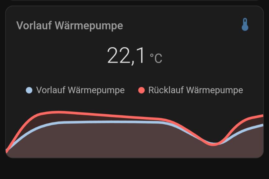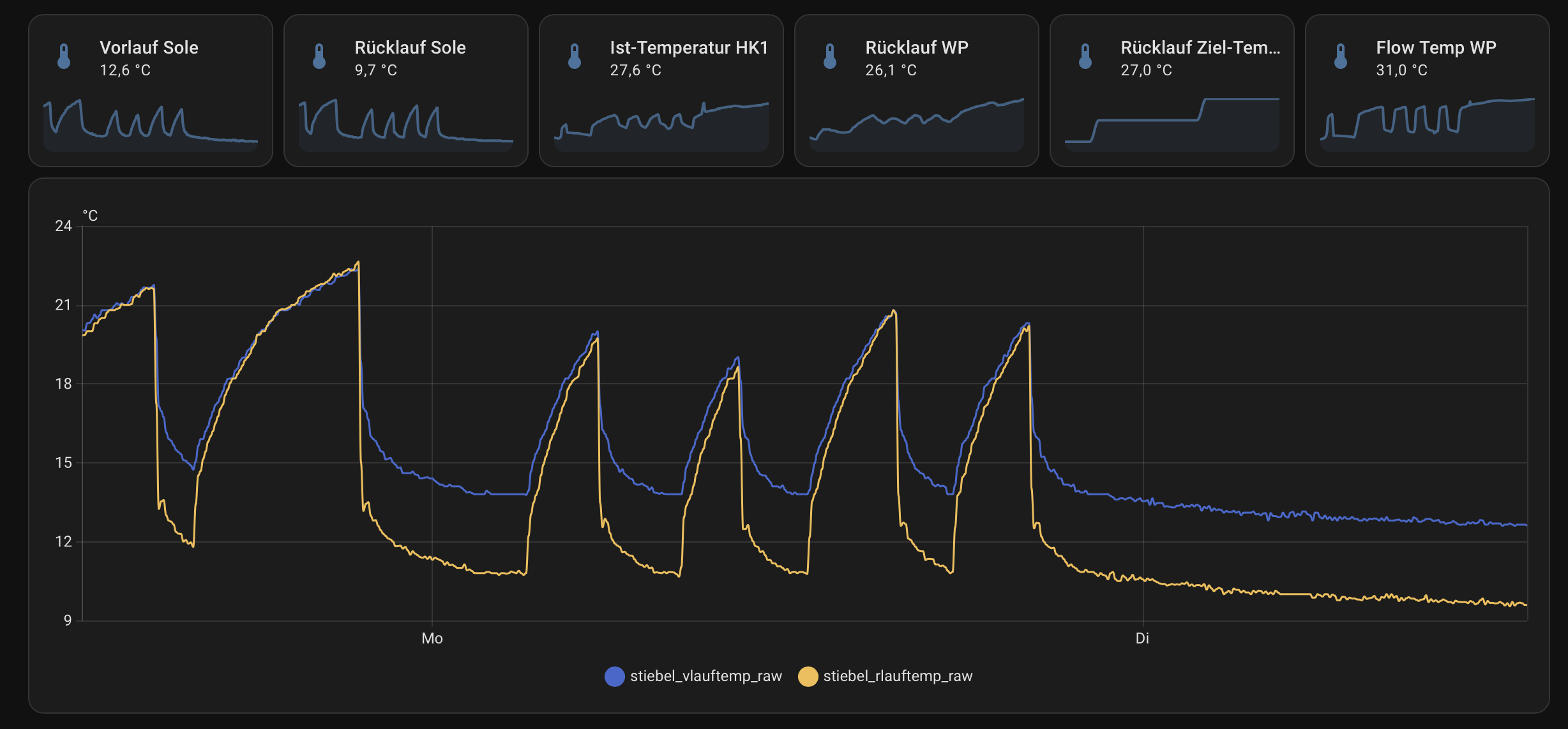 Hab mittlerweile auch auf das Aufheizprogramm umgestellt, beim Festwertbetrieb bin ich irgendwie nicht richtig zum Heizen gekommen. Bezüglich Sole Vor- und Rücklauf via Modubs auslesen; laut einem Stiebel Eltron Italien Mitarbeiter der im Projekt der HA custom Integration unterwegs ist, gibt es keine Plan diese Werte per Modbus auszuliefern - schade 😬 Aktuell ist die Solltemperatur HK1 auf 27° C eingestellt, Programm erhöht jeden Tag um 2K bis 35° C. Bivalenztemp Heizung wurde scheinbar durch das Aufheizprogramm von selbst auf 30° C eingegestellt, bin mir sicher, dass das davor auf -20°C oder so eingestellt war. Deswegen ist gestern Abend dann bald mal der Heizstab angesprungen und hat 6 kW gezogen, hab dann direkt die Bivalenztemp runtergesetzt, dann ging er gleich wieder aus. Nun stellt sich mir die Frage, ist es Notwendig mit dem Heizstab zu arbeiten? Hab die WPE-I 04 HK im Einsatz. An welchen Kennlinien lese ich das ab? Zumindest läuft sie nun seit gestern 20:30 Uhr durch, die Tage davor ging sie am Tag 3-4 mal ein, mit jeweils 3-4 Stunden Laufzeit. ![]() |