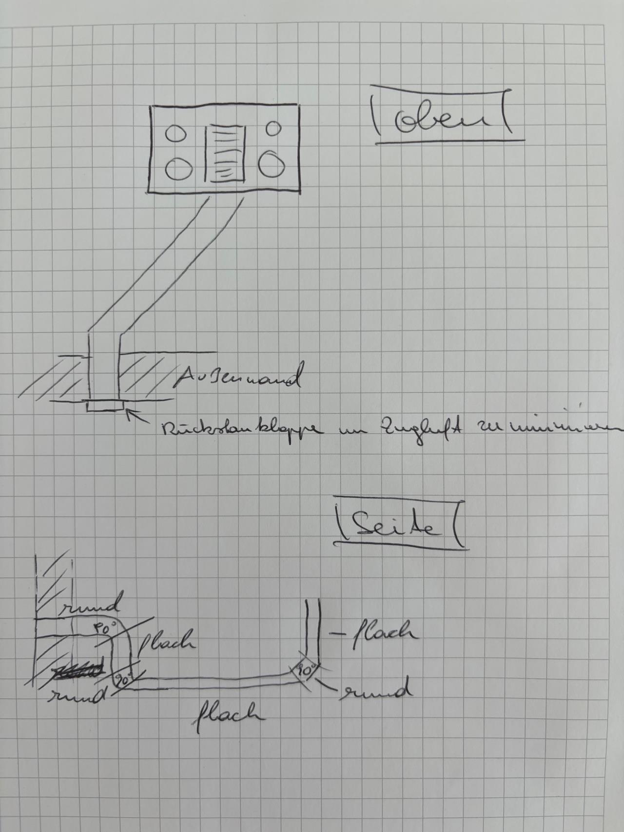 Er meinte auch, dass normalerweise ein 90° Bogen und ein Übergang von flach (was aus dem Dunstabzug kommt) auf rund vorgesehen ist und dass das ganze dann in einen Mauerkasten münden soll, wo eine Rückstauklappe verbaut ist.