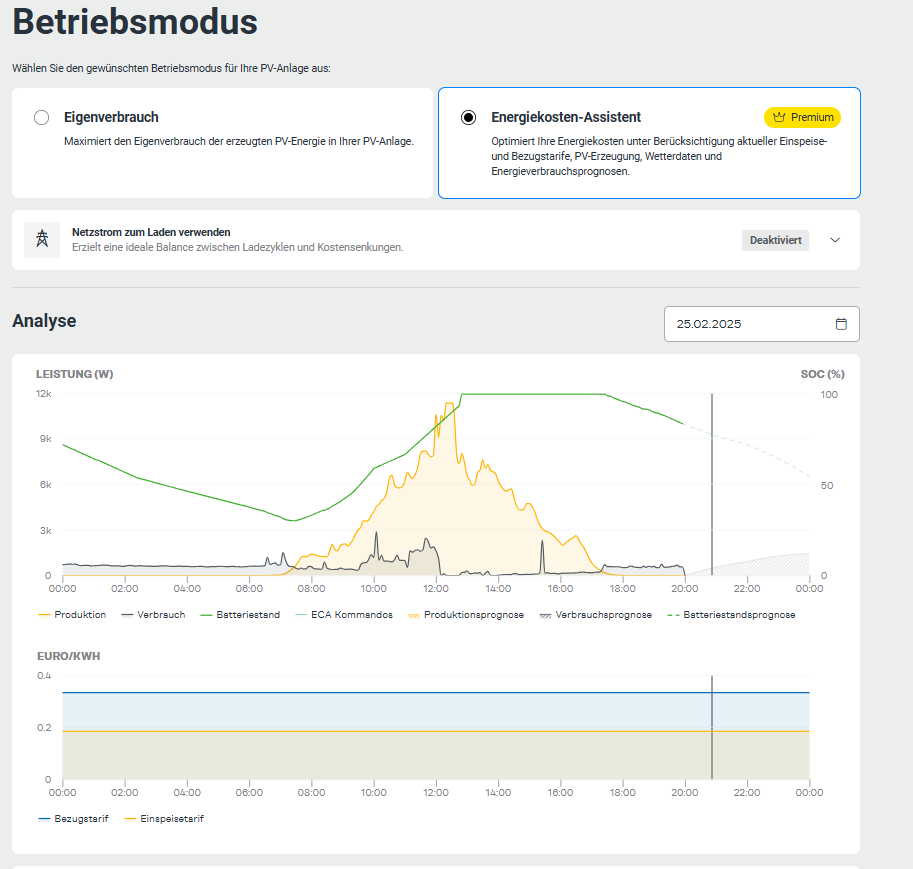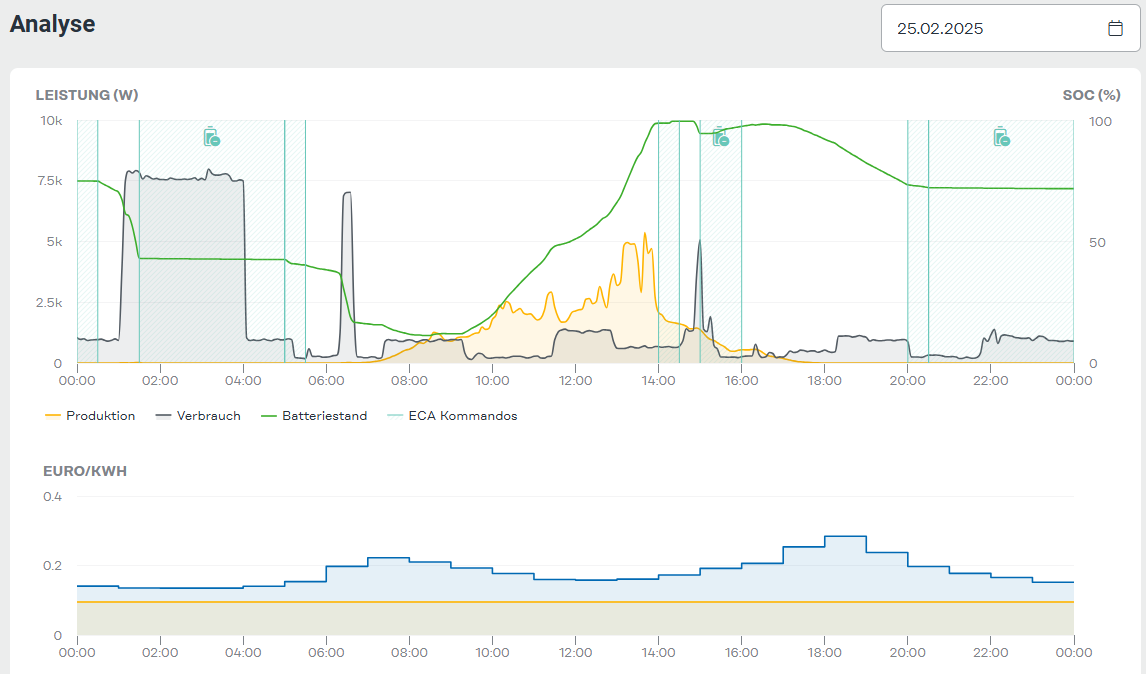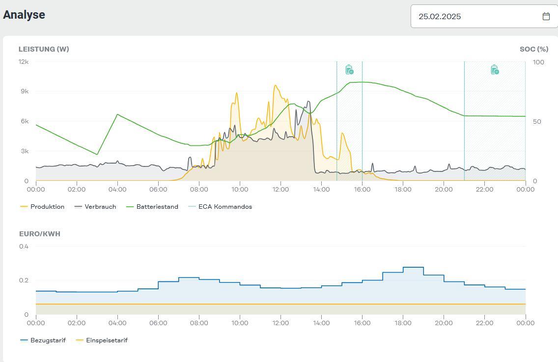 Hallo! Ich hatte den ECA auch für kurze Zeit aktiviert. Habe ihn aber wieder deaktiviert. Hat bei der Batterie Sperrzeiten eingeplant und die Batterie zwischen 50 und 80% belassen und aus dem Netz geladen (zwar in den günstigeren Abendstunden, aber nicht in den wirklich billigsten Zeiten). Werde ich wohl wieder manuell steuern. Wie ist eure Erfahrung mit dem ECA?? LG |