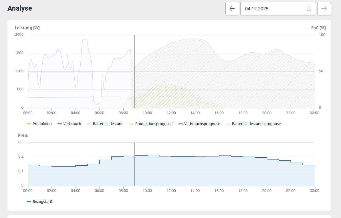 Einen Versuch war es Wert! Für mich wäre es schön gewesen, wenn es einen Betriebsmodus "Intelligent + Lebensdauer optimiert" o.Ä. gegeben hätte. Funktionen: - Erhöhung der Reservekapazität des Speichers an (Winter)tagen wo er sowieso nicht voll wird, oder im Sommer wo die Kapazität nicht benötigt wird, um mehr Reserve für Backup zu bekommen - Automatische Reduktion des SOC auf 80% an den Tagen wo die Nacht kurz ist und nächster Tag schön ist. - Periodische Erhöhung auf 100% für SOC Kalibierung der Batterie - Begrenzung der Ladeleistung abhängig von SOC - Speicher dann laden wenn am meisten Überschuss prognostiziert wird . Und nicht ab Sonnenaufgang Speicher füllen damit der den ganzen Tag mit 100% rumsteht und am Vormittag/Mittag Einspeiselimitierungen aktiv sind. Letzter Punkt ist vielleicht sogar zum Teil umgesetzt. Fairerweise muss man sagen es soll nur ein Energiekostenassistent sein und ich habe mir einfach zu viel erträumt.😅 Ja und wie vermutet macht er nichts mit einem Fixtarif (jetzt auch getestet) |