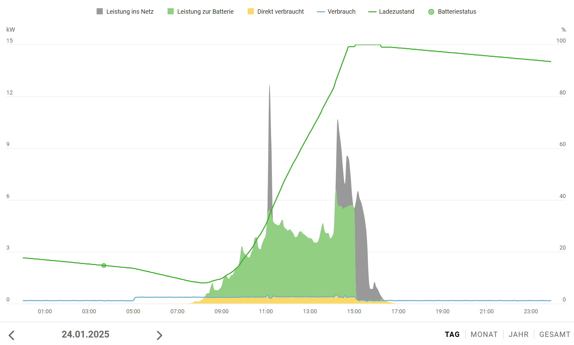 Hätte ich nicht vorgewärmt, so gingen jetzt mindestens für 2 Stunden 3-4 kW ins Netz - zwar auch nicht verloren, aber weniger Ertrag als Eigenverbrauch!