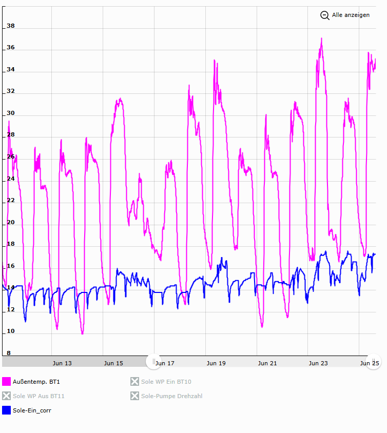 bei uns geht die schöne Zeit los. Heute schon kurzzeitig an der 40er Marke gekratzt... 😲 (OK... das ist im sonnigen Hitze-Stau Ansaug-Eck der KWL KWL [Kontrollierte Wohnraumlüftung]... aber trotzdem) Im Haus - super angenehm 😎 Sole-Ein ist Dank dauer-Kühlung und etwas Entfeuchtung (war bislang heuer noch sehr wenig notwendig) schon auf ~17°C hochgepusht. Sollte sich aber nun wieder etwas beruhigen, nachdem die Masse vom Haus nun abgekühlt wurde |