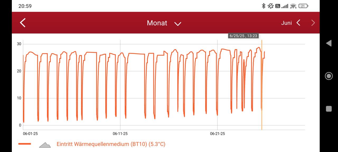 Im Waldviertel bis jetzt noch keine Kühlung notwendig gewesen, aber heute schon 24°C im Wohnzimmer. Daher bis jetzt noch direkt nach dem WW WW [Warmwasser] Takt 5,3°C Sole ein Temp 😅 Hoffentlich genug Potenzial zum kühlen 🙌 |