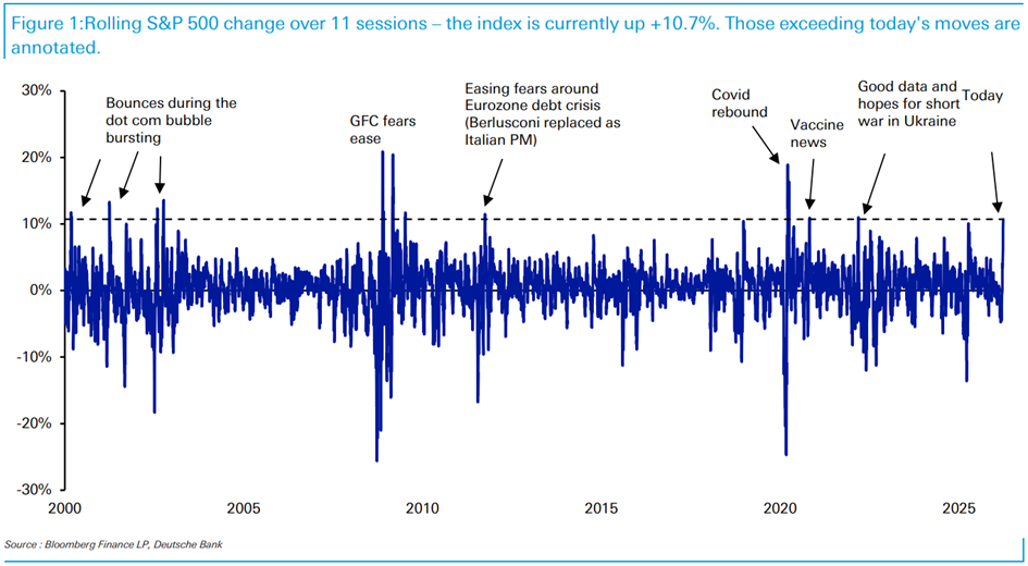 jene, die das gemacht haben, freuen sich über neue All-time-highs: Diesen Mittwoch wurde beim S&P 500 erstmals die 7.000 Punkte geknackt - in den vergangenen 11 Tagen hat der Index etwa 11% zugelegt (was noch mehr war, als am Liberation Day wo der Index im vergleichbaren Zeitraum 10,4% dazugewonnen hatte). Interessant in diesem Zusammenhang ist, dass der Index seit 2000 im vergleichbaren Zeitraum von 11 Tagen lediglich 15 mal eine Rallye mit über 10% hingelegt hat. |
