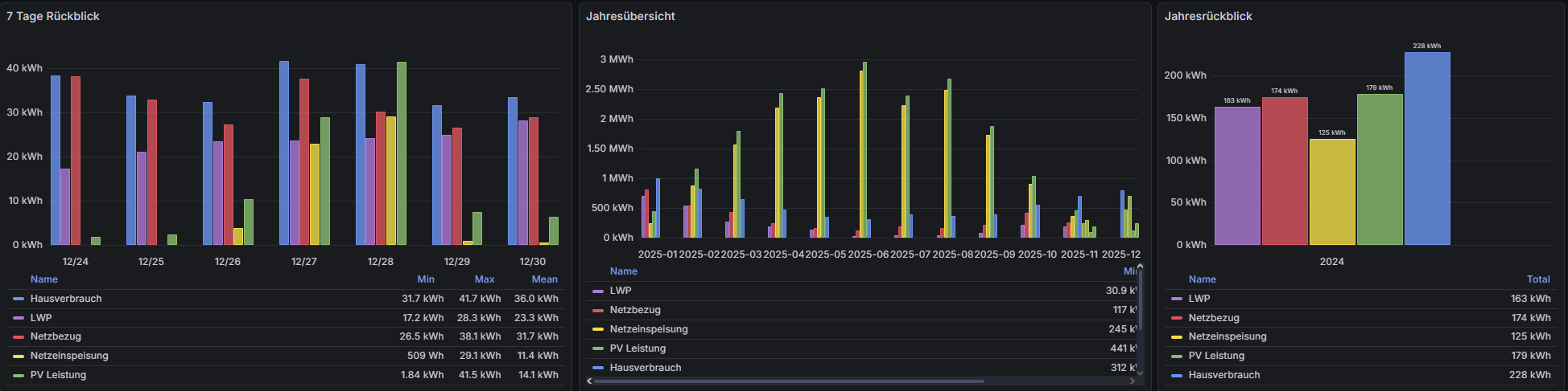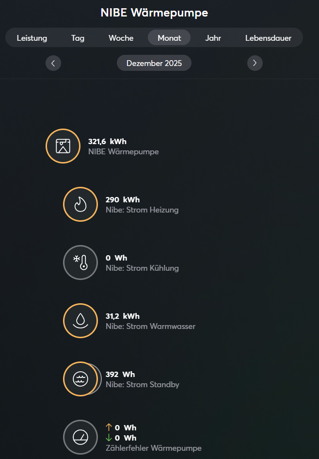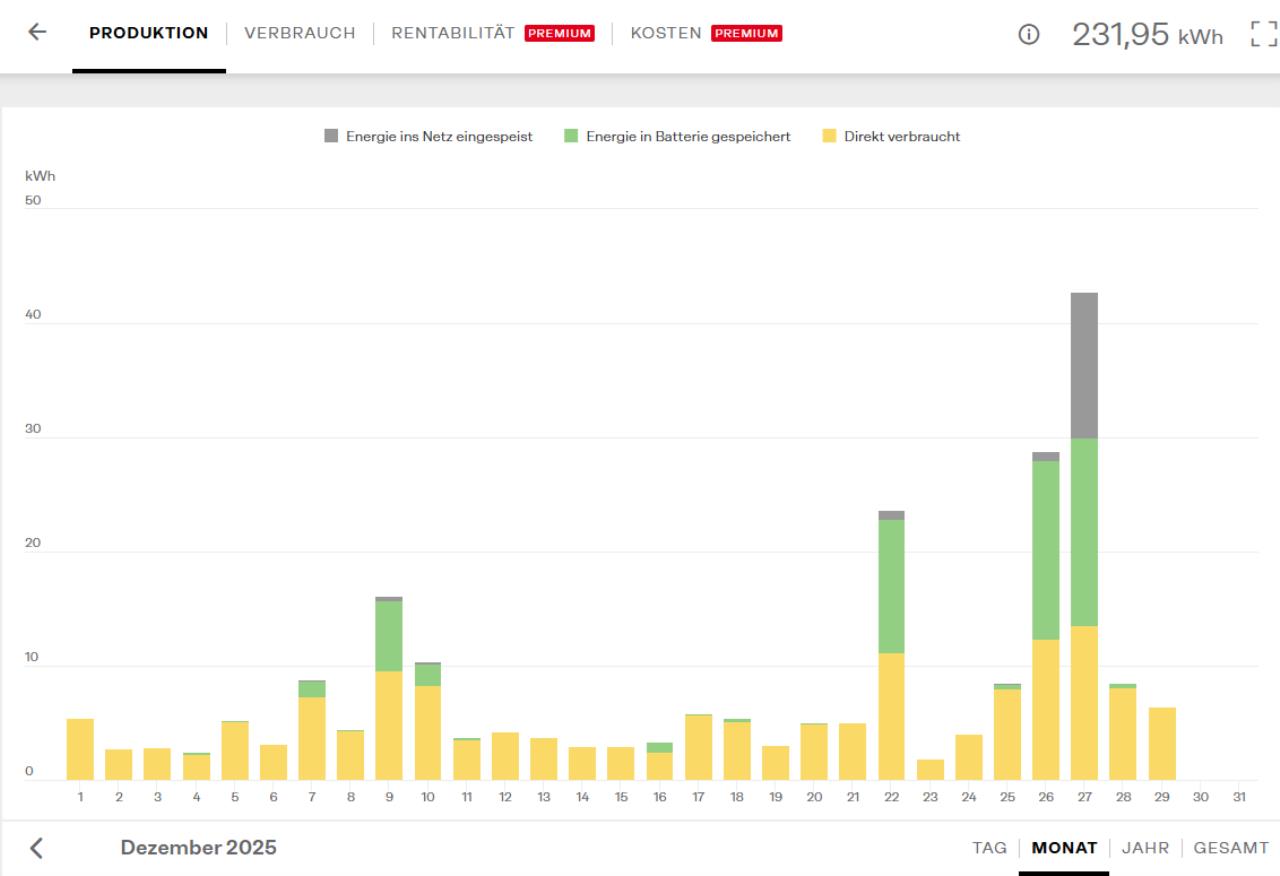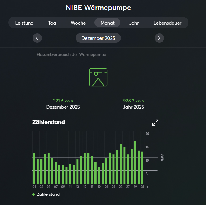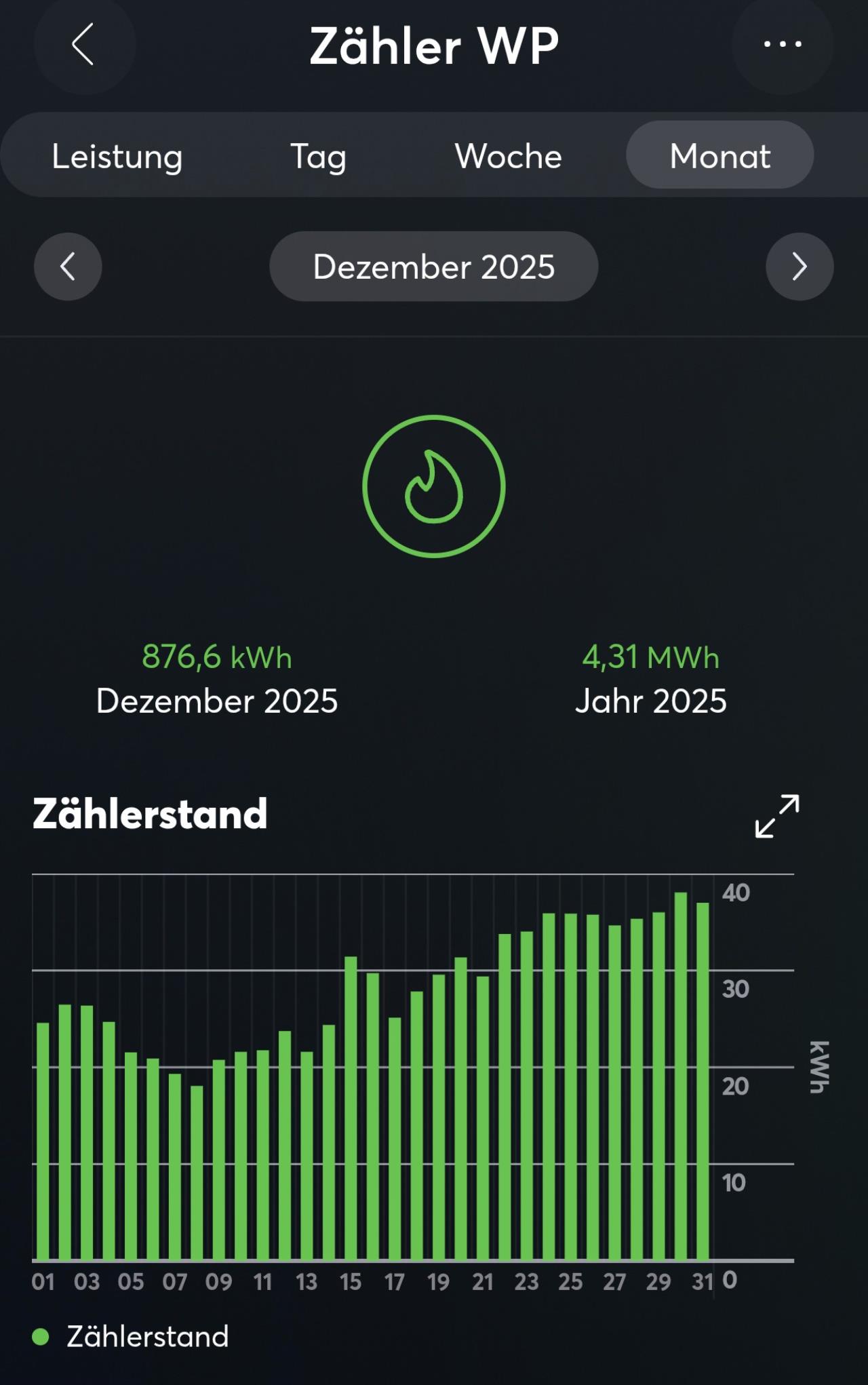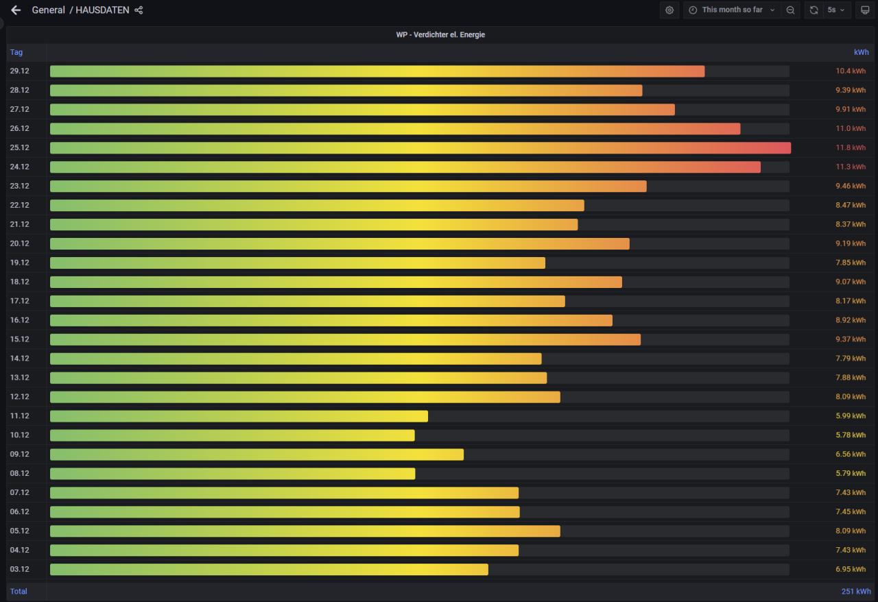 Hier die Tageswerte des Verdichters für Heizen inkl. WW, da kommt dann noch ca. 1kWh pro Tag für Pumpen und Steuerung dazu. Also im Schnitt so 9,5kWh/Tag all-in an el. Energie im Dezember. IT 22.5-23°C; Nordosten Österreich wo wie erst seit ein paar Tagen wieder wissen wie die Sonne aussieht. Strombezug (gesamt) sieht dafür erschreckend aus, Verbrauch ist natürlich nochmal höher (muss ich erst visualisieren). Am 20.12 wurde das E-Auto gleich zwei mal geladen 🤣 . Ich hab zwar rel. viel mit Grafana visualisiert aber die monatliche Excelaufzeichnung mach ich dann doch noch. Mit der Vorlage gebe ich dir aber recht, das sollte sich jeder so hinschnitzen wie es für ihn passt. |