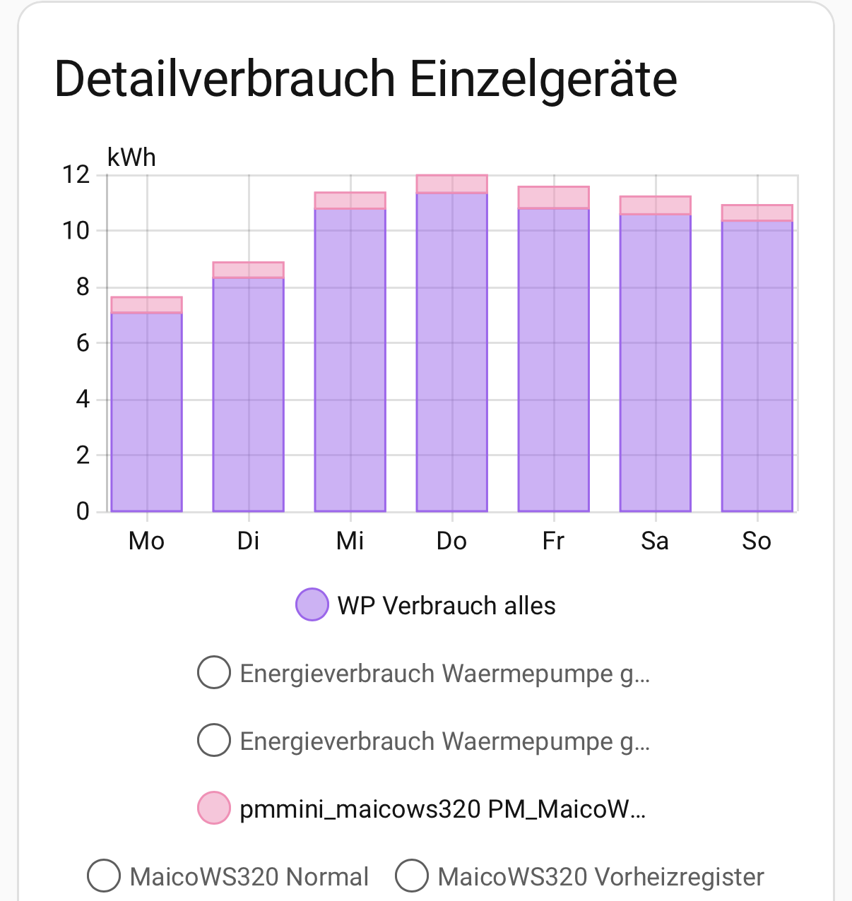 Ich denke dass einige mit "all in" den gesamten Stromverbrauch der WP WP [Wärmepumpe] meinen (also inkl. Steuerung, UWP, Sole-Pumpe...) Und das spielt dir auch nicht unbedingt in die Karten: Ich hab im Dezember einen Tagesschnitt von 7,9kWh fürs Heizen und knapp 2kWh für KWL KWL [Kontrollierte Wohnraumlüftung] inkl. WW. Restlicher Hausverbrauch war bei 7,8kWh/Tag (ohne BEVBEV [Battery Electric Vehicle, Elektroauto]). |