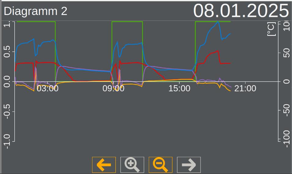 Das ist ab etwa September, wobei sie erst etwa im November zu heizen begonnen hat. Leider scheint bei mir kein weiterer Zaehler verbaut zu sein oder ich finde die Daten einfach nicht. Ich bin mit der Installation eigentlich sehr zufrieden und wuerde auch nichts aendern wollen. Jetzt ist sie ja auch leise. Sie laeuft jetzt bei Kompressorlimit 45% zwar laenger, aber macht immer noch mehrere Stunden Pause. WP 1: Ein (Grün) WP 1: Temp. Kond. (Rot) WP 1: Temp. Verd. (Gelb) WP 1: Temp. Sauggas (Violett) WP 1: Temp. Heissgas (Blau) Heute lief die Pumpe von 0:00 bis 03:42, 08:50 bis ca. 11:30, 16:30 bis jetzt. Korrigiert mich falls ich das falsch lese. |