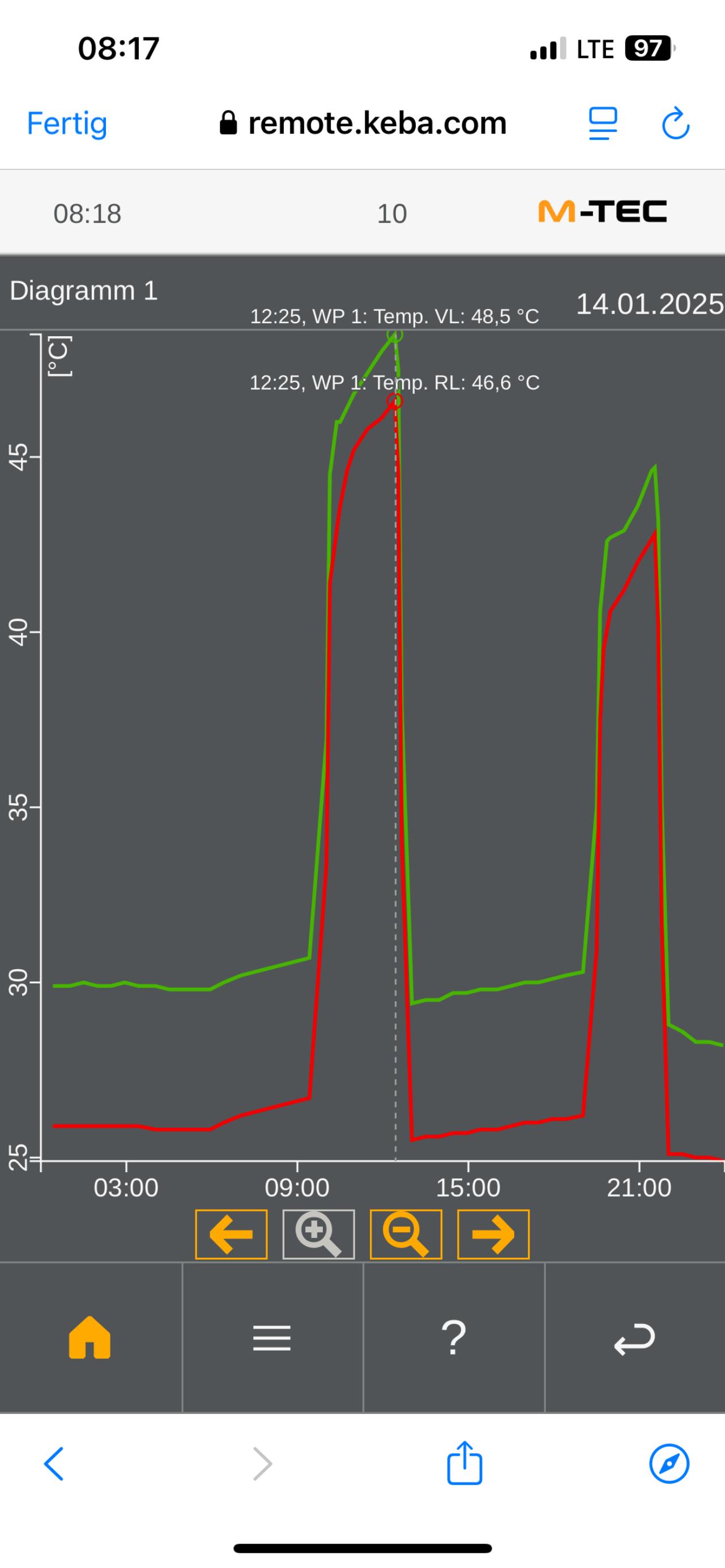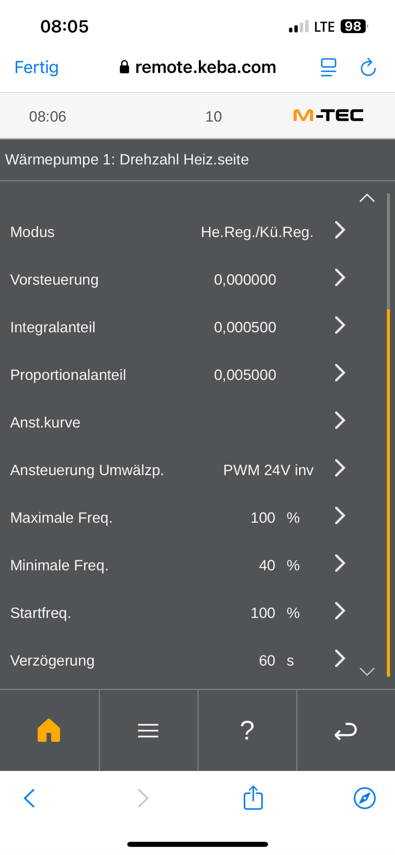 @RaBo76 Also du schlägst vor die Spreizung beim Heizen zu reduzieren und beim WW WW [Warmwasser] zu erhöhen? Aktuell ist Spreizung Heizen 4K, Spreizung Warmwasser 2K. Ich könnte mal beides auf 3K setzen. Die min Frequenz der UWP habe ich mal testweise von 35% auf 40% erhöht. Ich möchte auch nicht alle Änderungen auf einmal machen da ich ja nachher nicht weiß was sich wie auswirkt. Die WW WW [Warmwasser] Bereitung startet wenn die WW WW [Warmwasser]-Temp nicht unter 40°C fällt nach Zeitplan (10:00) und dauert oftmals bis nach Mittag (gestern z.B. peak Uhr 12:25, 48,5°C VL VL [Vorlauf] --> 47°C Wassertemp.). EDIT: Screenshots |
