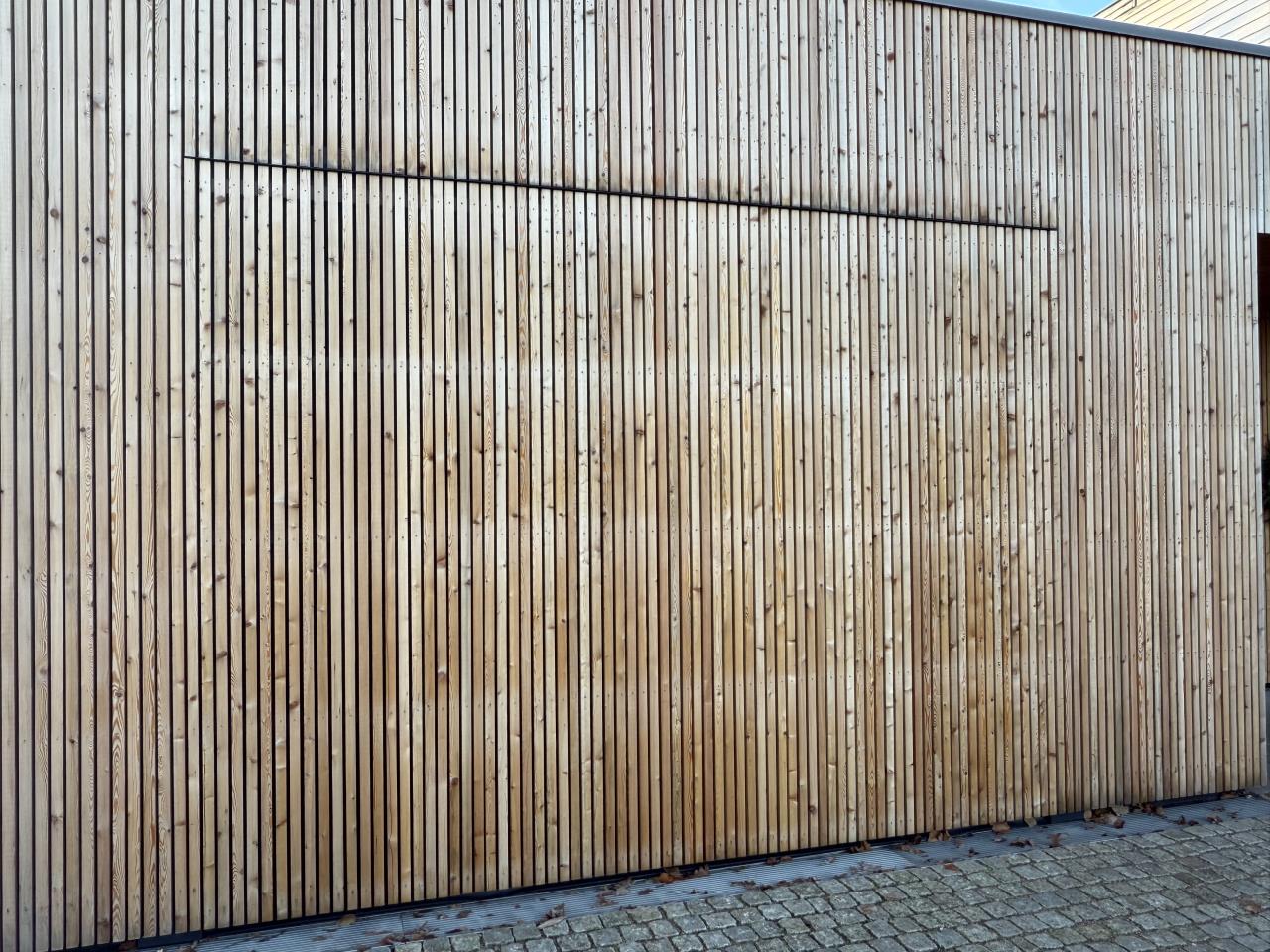 ich habe eine Holzfassade mit vertikalen Leisten mit sehr gutem umfassdenden Konstruktivem Holzschutz bauen lassen. Leider gibt es an der Oberseite des Garagentors eine Problemstelle, vielleicht kann mir jemand einen Tipp für die best practise geben. Siehe Fotos von der Problemstelle, die oberen Leisten werden wohl von unten zu häufig befeuchtet. Ich habe auch schon eine Idee wie es umgebaut werden könnte, siehe Skizze anbei. Würde mich freuen zu hören wie ihr die Idee findet und ob ihr noch andere Ideen habt. Man könnte die oberen Leisten natürlich auch 1cm absägen, das würde aber meiner Einschätzung keine gute Optik ergeben, sicher aber besser als nichts zu machen.