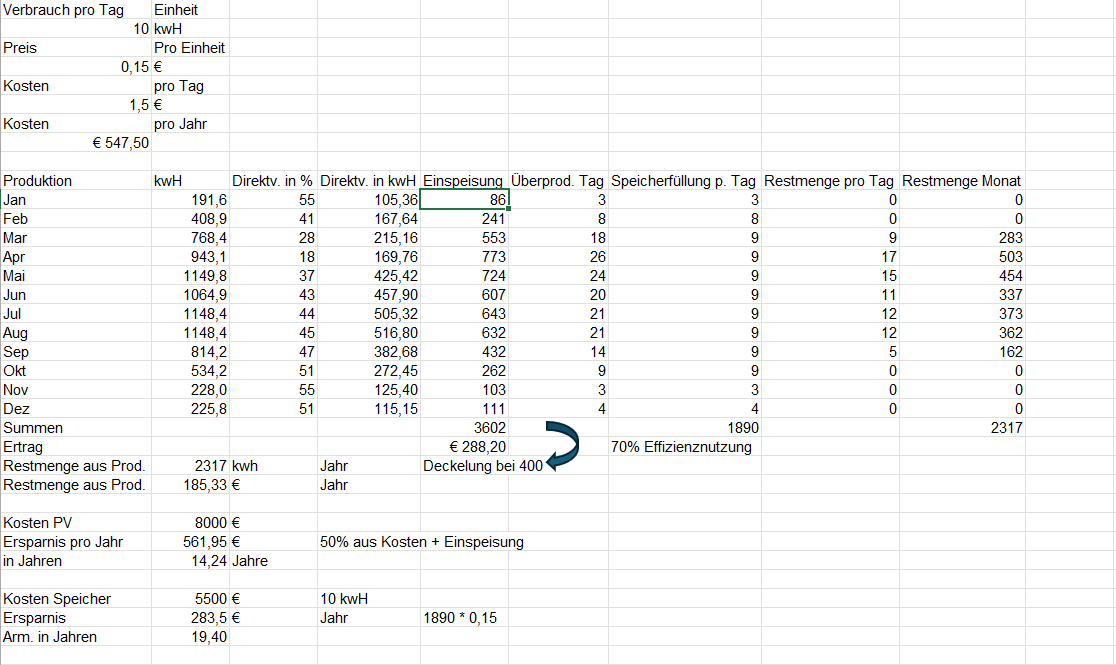 Hi, vielleicht kann mir ja da jemand drüberschaun: Die Werte habe ich von meinem Nachbarn genommen, da ähnliche Situation. Ich war ja bei der PV mit 15 Jahren schon skeptisch, dann aber doch genommen, da mir der Gedanke gefällt. Speicher sodann 20 Jahre find ich aber brutal und eigentlich nicht für sich sprechend. Also, wenn meine Rechnung stimmt? |