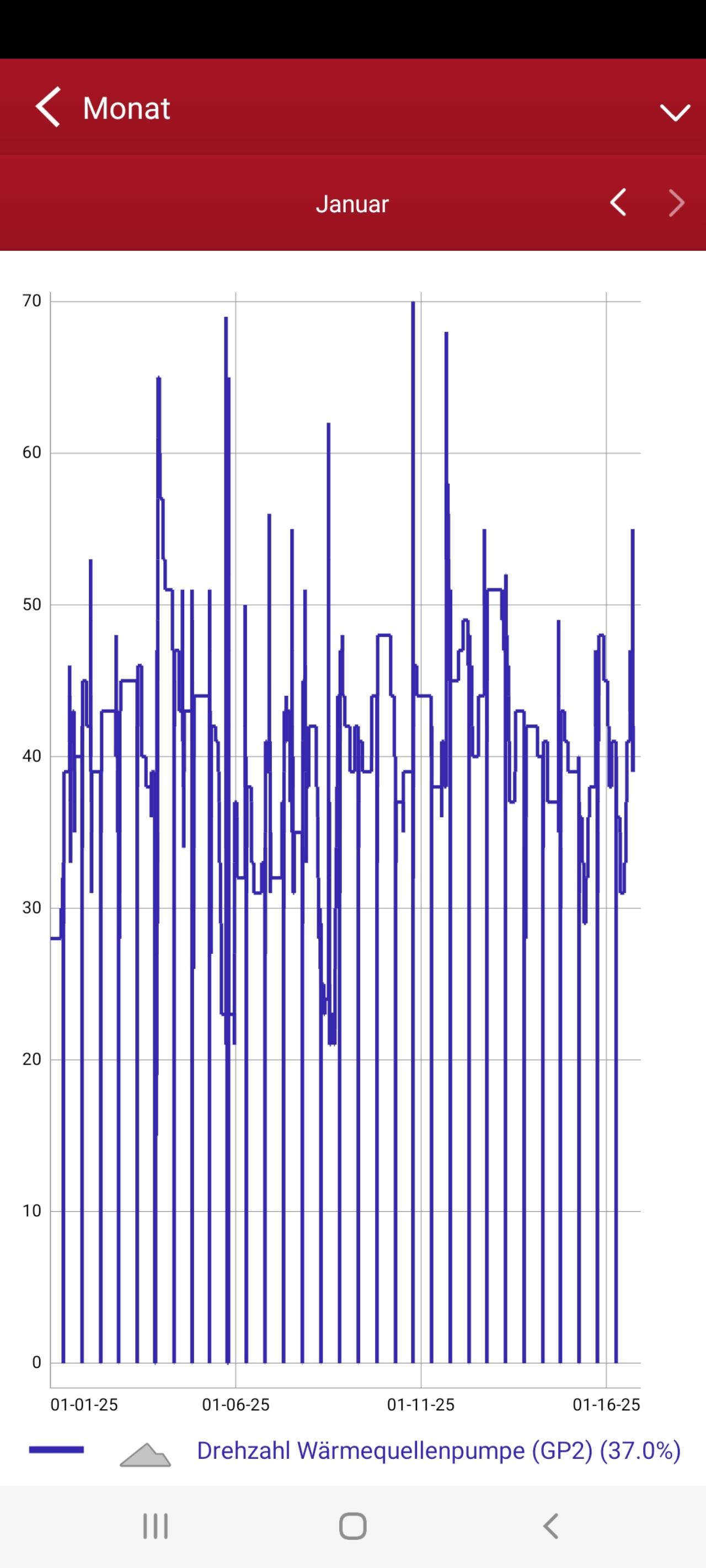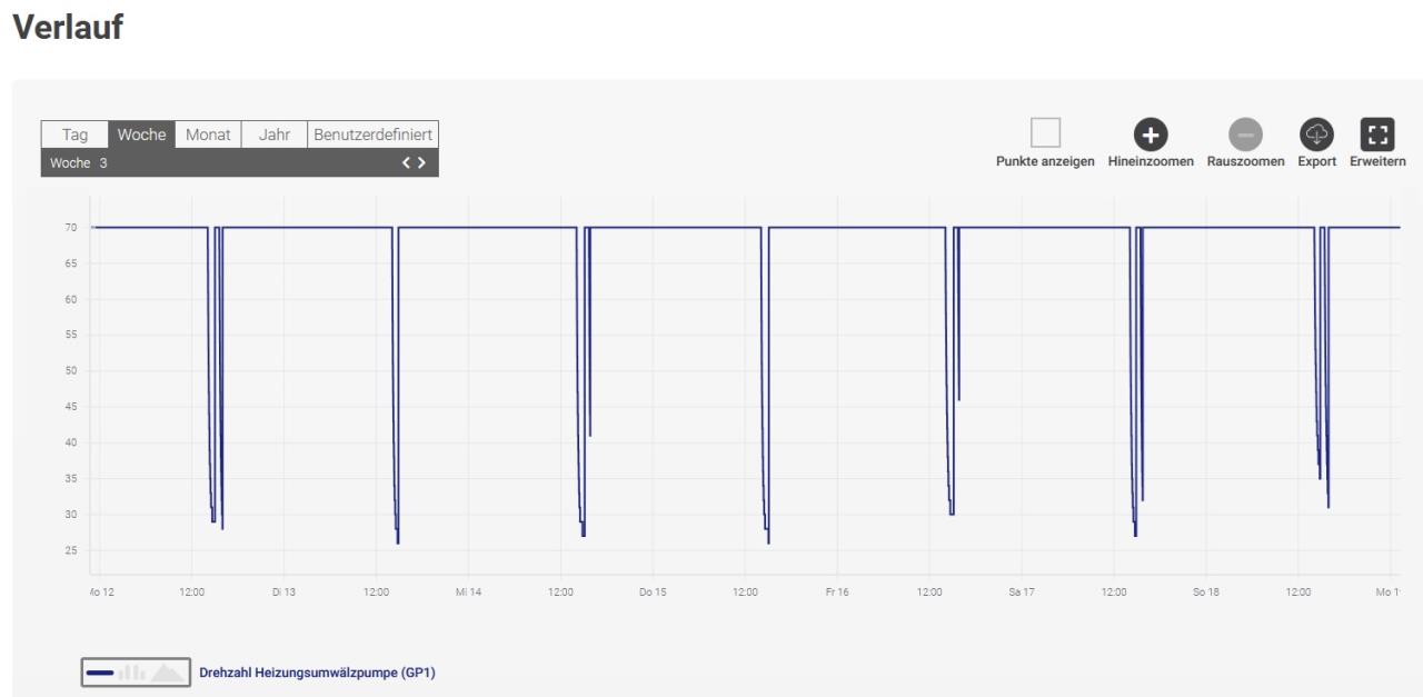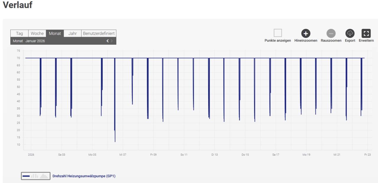 Also ich habe das mal so gemacht, wie Ihr sagt. Ab 15:50 Uhr, jeweils für 10 min. Zuvor waren die Durchflussmengenmesser Bohrung 1/2 auf 3/4 l/min, Drehzahl Auto 36%. Ablauf: In 7.1.2.7 Pumpendrehzahl WQ-Medium auf Manuell gestellt, Drehzahl 100%, Volumenstrom war dann 31-36,5 l/min, die Mengenmesser auf 16,5/18,5 l/min. Bohrung 1 abgedreht (0 l/min), Mengenmesser 2 geht auf Maximum (>20 l/min). Bohrung 1 wieder aufgedreht, Mengenmesser gehen auf 16,5/17,5 l/min. Bohrung 2 abgedreht (0 l/min), Mengenmesser 1 geht auf Maximum (>20 l/min). Bohrung 2 wieder aufgedreht, Mengenmesser gehen auf 16,0/17,5 l/min. In 7.1.2.7 Pumpendrehzahl WQ-Medium auf Auto gestellt, Drehzahl 34%, Volumenstrom war dann 15,2 l/min, die Mengenmesser auf 3,0/4,5 l/min. Der Durchflussmesser Bohrung 1 zeigt also immer/weiterhin etwas weniger als 2 an. Also wie Ihr vermutet habt wohl nur ungenaue Anzeige und von daher ok. Was das für Ausschläge um 5:00 und 17:40 sind, weiß ich nicht. Pumpe u.a. aus? Da war dann auch mein Hausstromverbrauch niedrig. |
