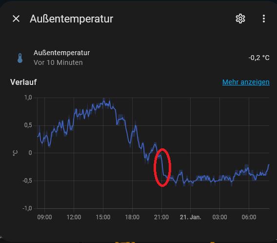 Die Außenseite der Mauer hat eben nicht Umgebungstemperatur, es entsteht im Winter ein Temperaturgradient. Wenn die Außenwandtemperatur gleich Umgebungstemperatur wäre, hättest du ein adiabtes System, das heißt perfekte Isolierung und kein Wärmefluss. Im Sommer ist der Effekt umgekehrt, da wird der Sensor die Temperatur unterschätzen. Du kannst mal testweise das Gehäuse offen lassen, darin steht ja quasi die Luft und gibt eine gewisse Isolierung. Also für bessere Umspülung mit Umgebungsluft sorgen. Am besten wäre den Sensor ein paar Zentimeter von der Wand wegrücken. Generell ist es in meinen Augen aber egal wenn es 2-3 Grad Abweichung gibt, du trimmst ja die Heizkurve auf Wohlbefinden bzw. Wärmebedarf vom Haus ein, also auf das Ergebnis innen. Die Unschärfe vom Messwert geht ohnehin in der tageszeitlichen Außentemperaturschwankung unter beziehungsweise wird von der thermischen Trägheit des Hauses geglättet. |