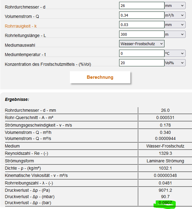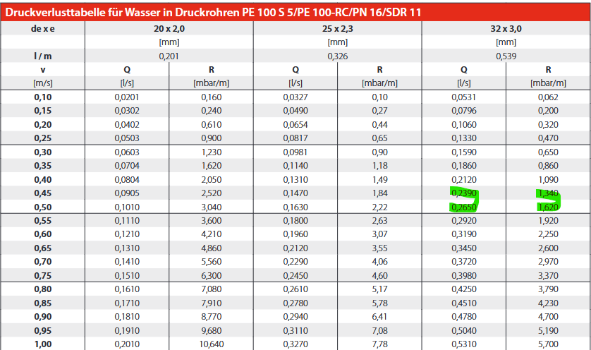 Sobald die Durchflussleistung aber nur mehr PDesign der WP WP [Wärmepumpe] ist (1,29m³/h / 4 = 0,32m³/h je Sondenrohr ist sie weg die Turbolente Strömung aber der Druckverlust ist auch viel niedriger